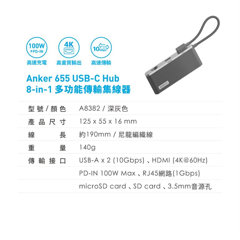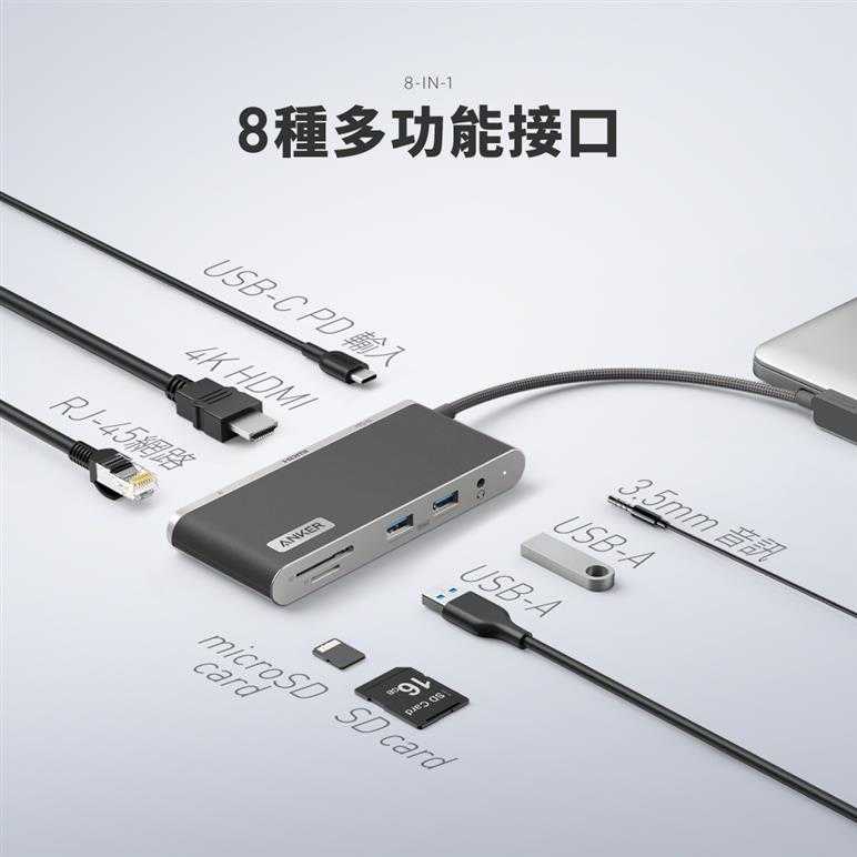 ● 8種多功能接口:USB-C PD輸入、4K HDMI、RJ-45網路、3.5mm 音訊、USB-A、micro SD card、SD card