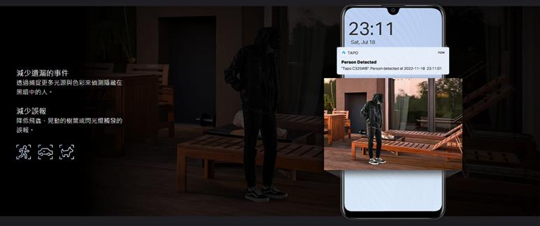 - 人物/動物/車輛偵測 - AI智慧偵測(免費)可辨別人物、動物與車輛,並透過App通知用戶‡