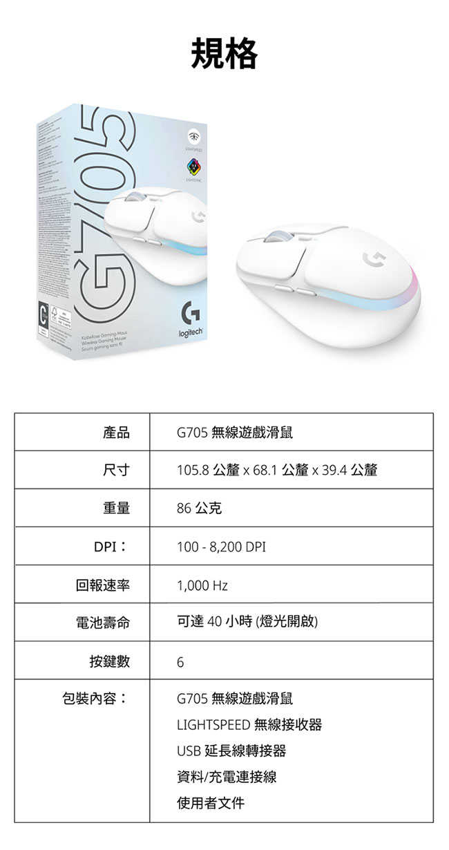 Logitech 羅技 G705 美型炫光白色 遊戲電競滑鼠原價 2990 【現省 1000】 {{specImage.SkuName}}