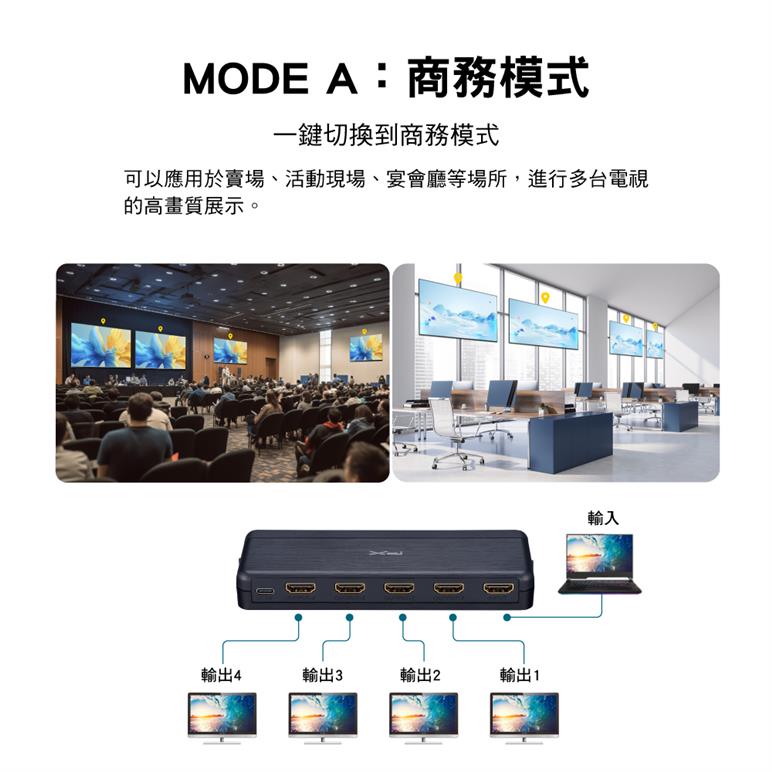 ● 將信號源影音同步分配到4台顯示器設備