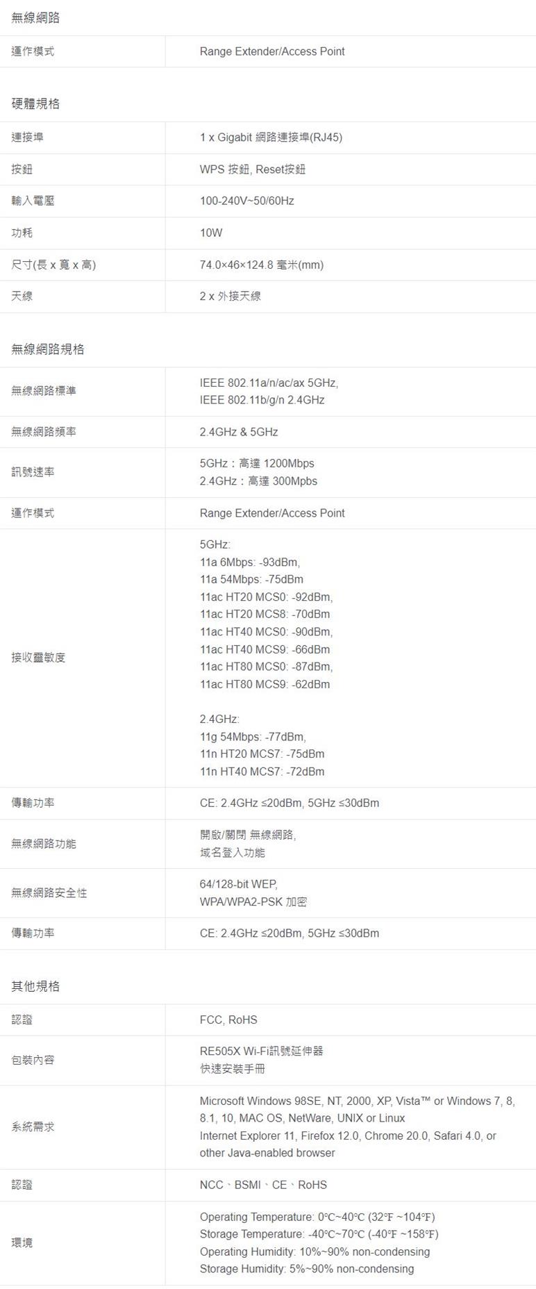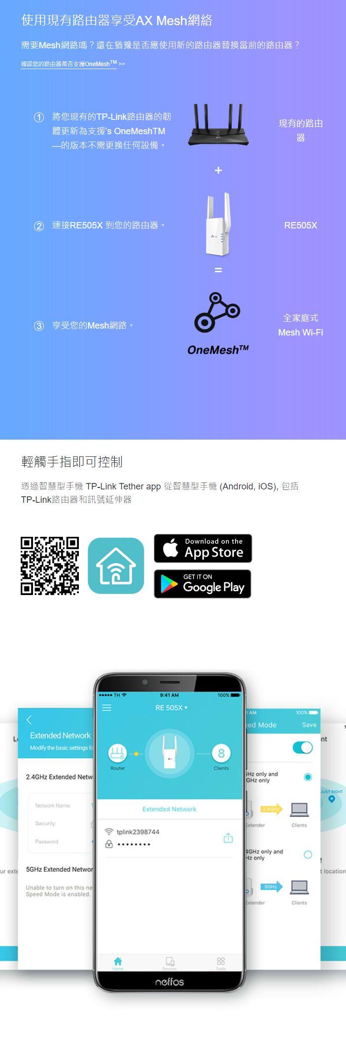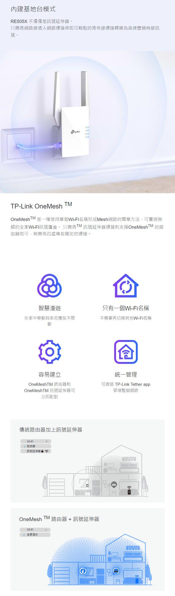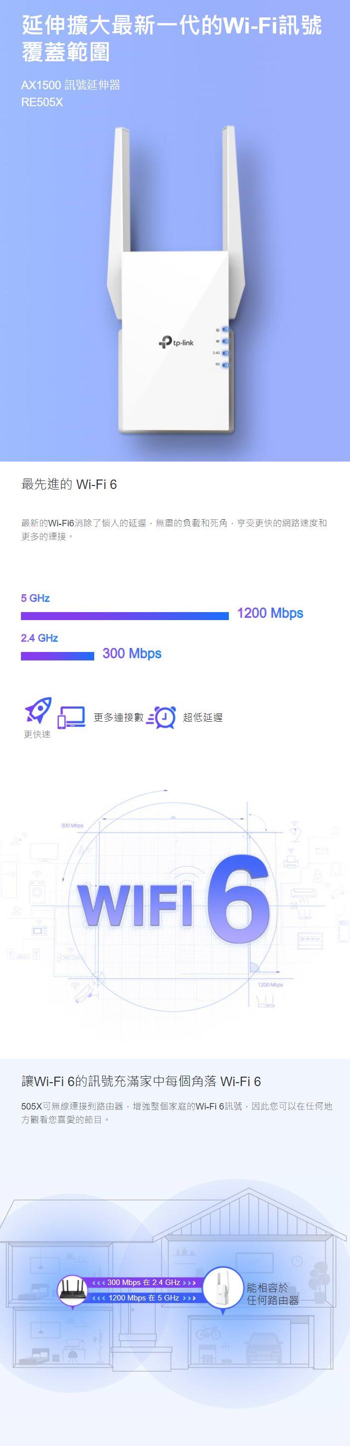 - RE505X配備了最新的無線技術Wi-Fi 6,以實現更快的速度,更大的容量並減少網路擁塞。