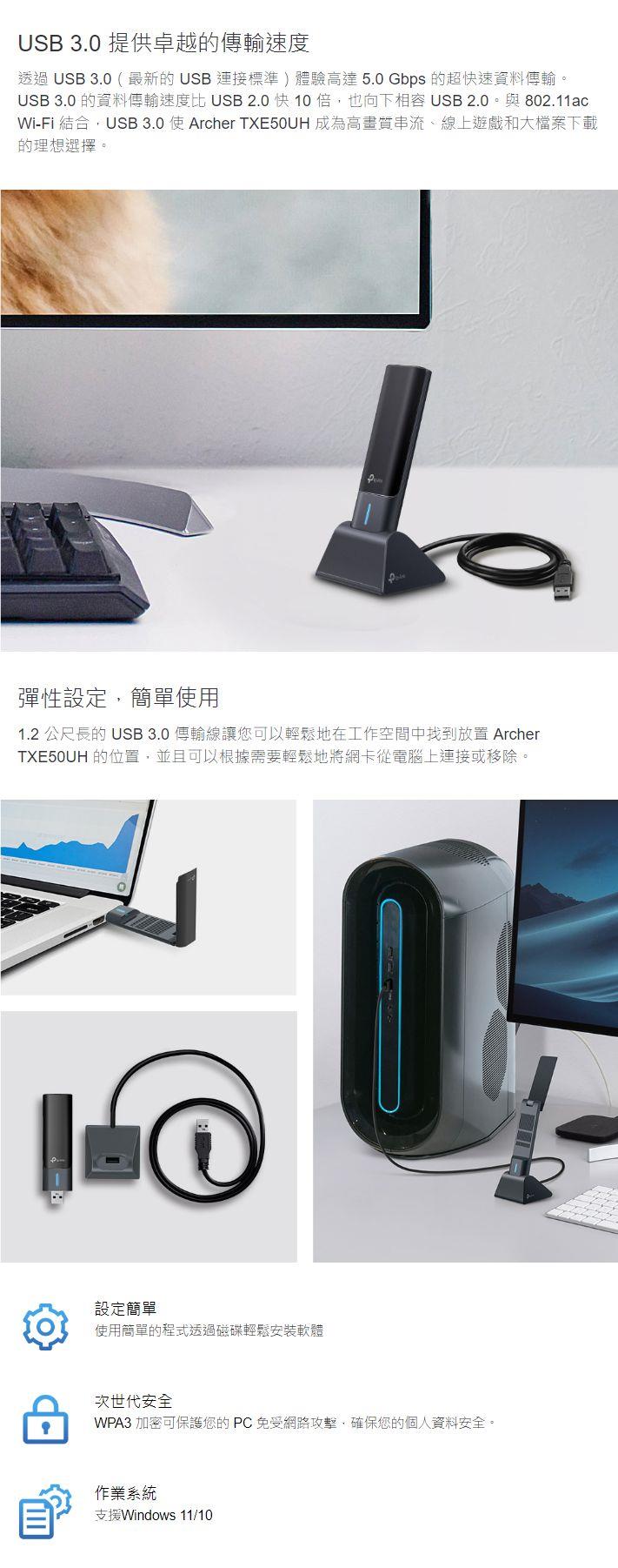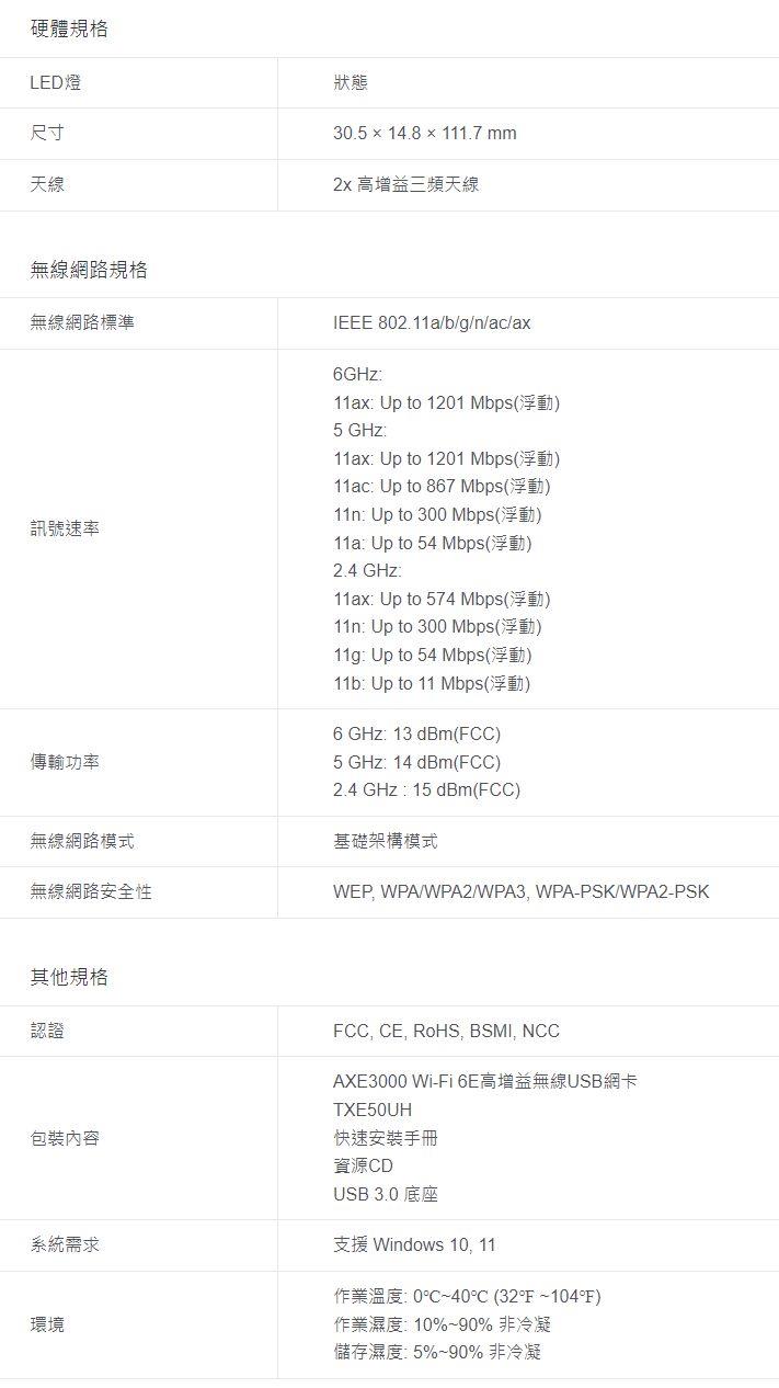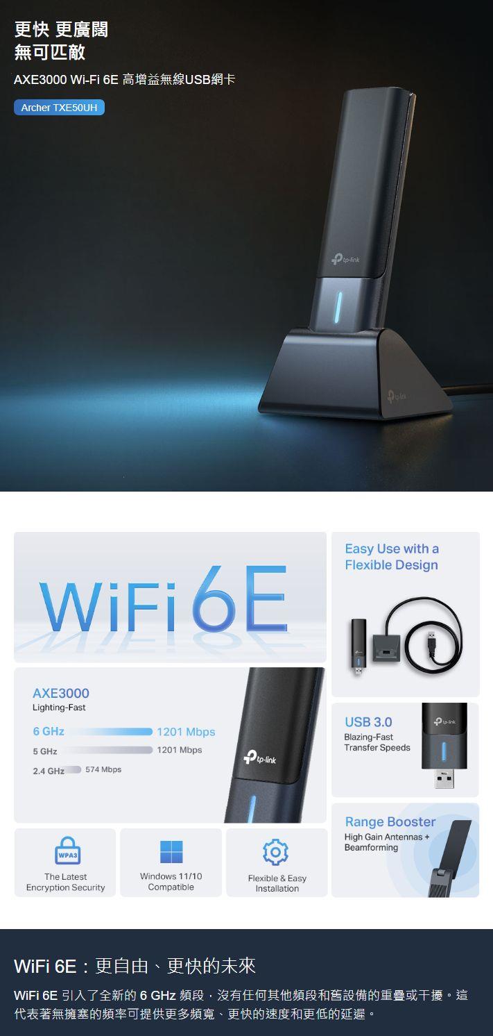 - 高速 WiFi 6E - 速度高達 1201 Mbps (6 GHz) + 1201 Mbps (5 GHz) + 574 Mbps (2.4 GHz)。