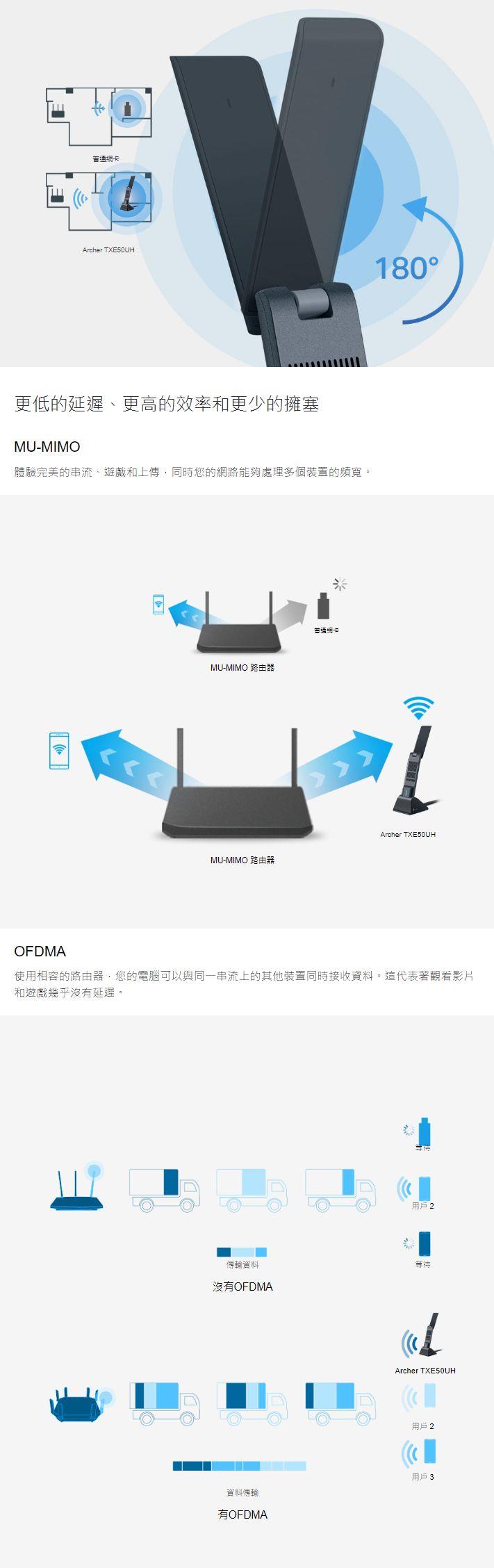 - 低延遲遊戲體驗 - OFDMA 和 MU-MIMO 確保為您的電腦提供最高效的 WiFi 連線。