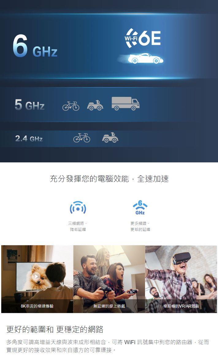 - 三頻無線 - 2.4 GHz、5 GHz 和 6 GHz 頻段可實現更靈活的連線。
