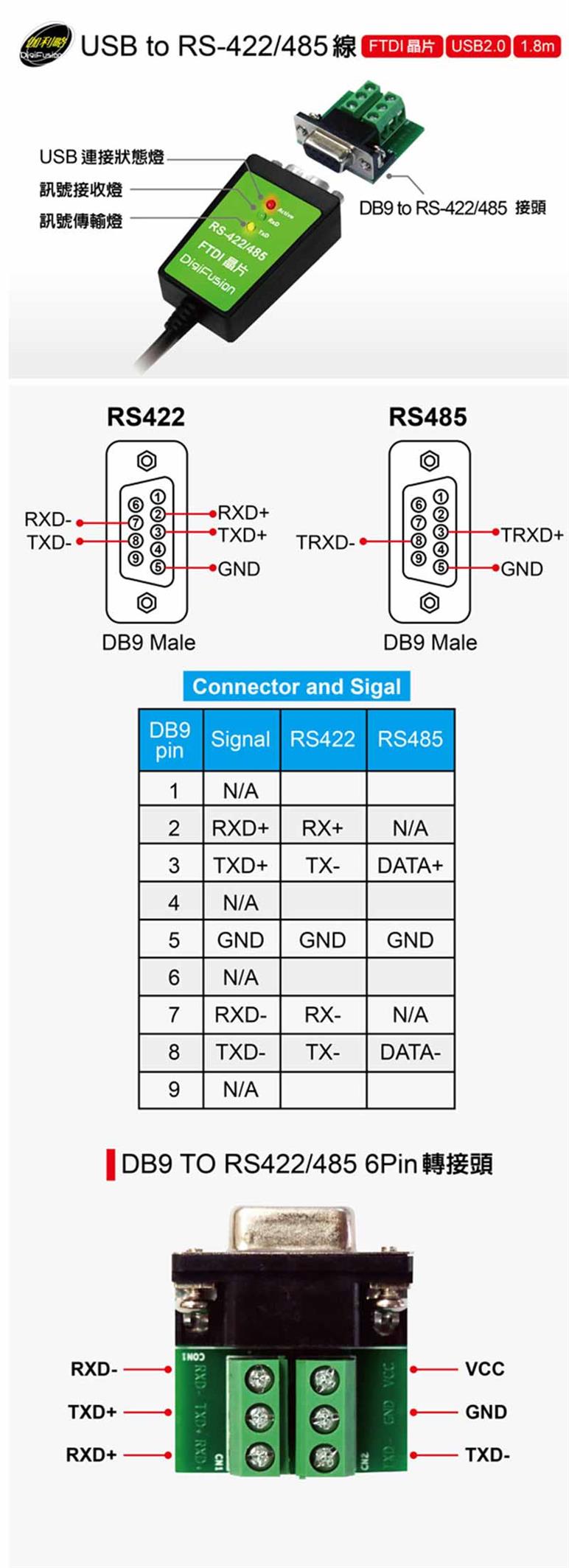 | 傳輸介面 | USB2.0 轉 RS422/485 (附贈DB9 轉 RS422/485 6Pin 轉接頭) |