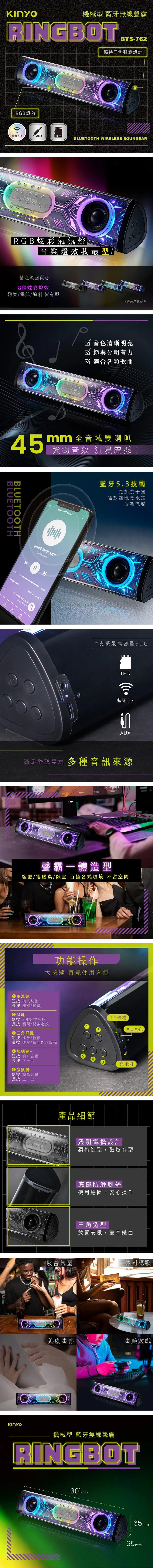 - 功能控制:開/關、模式切換、音量/曲目調整、播放暫停、RGB燈效