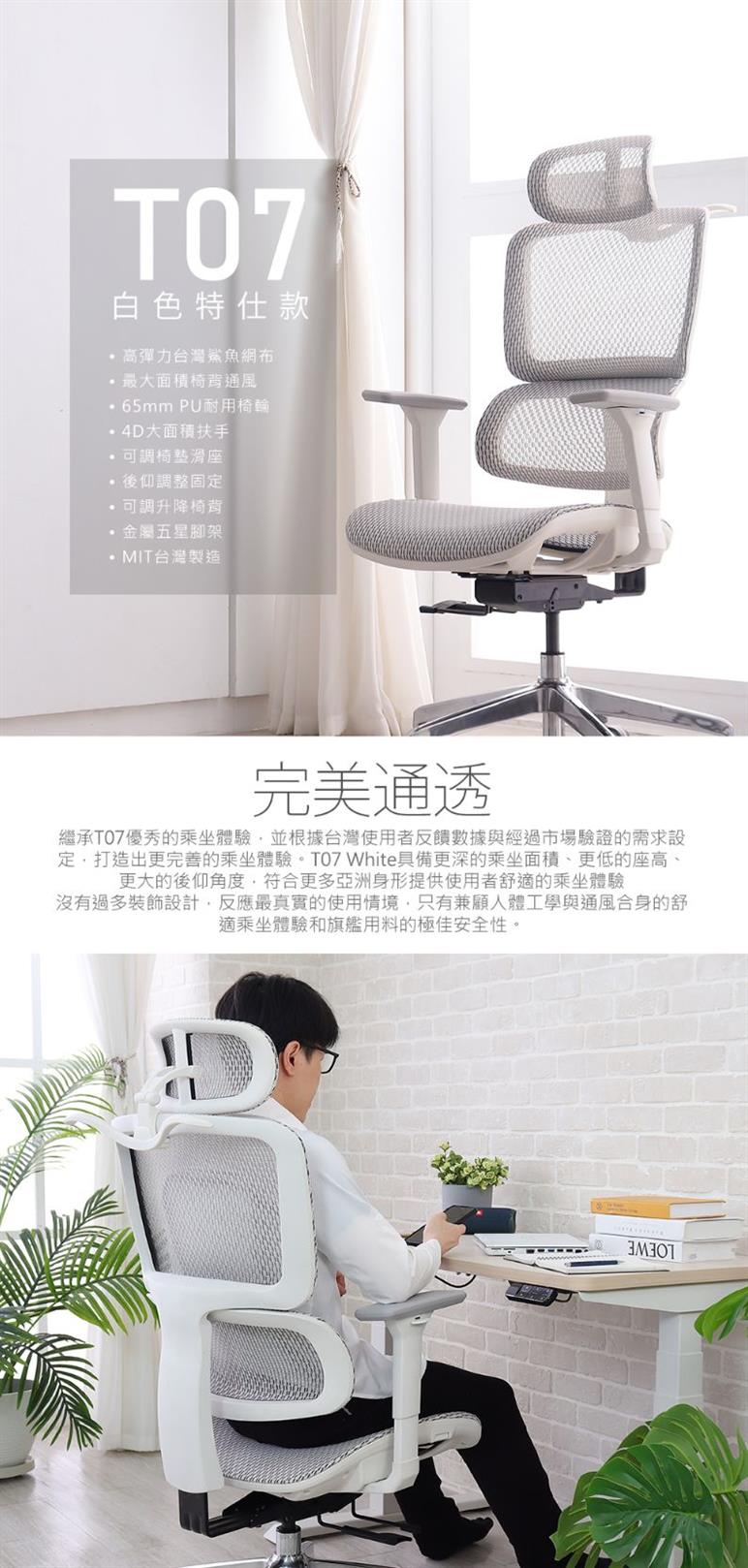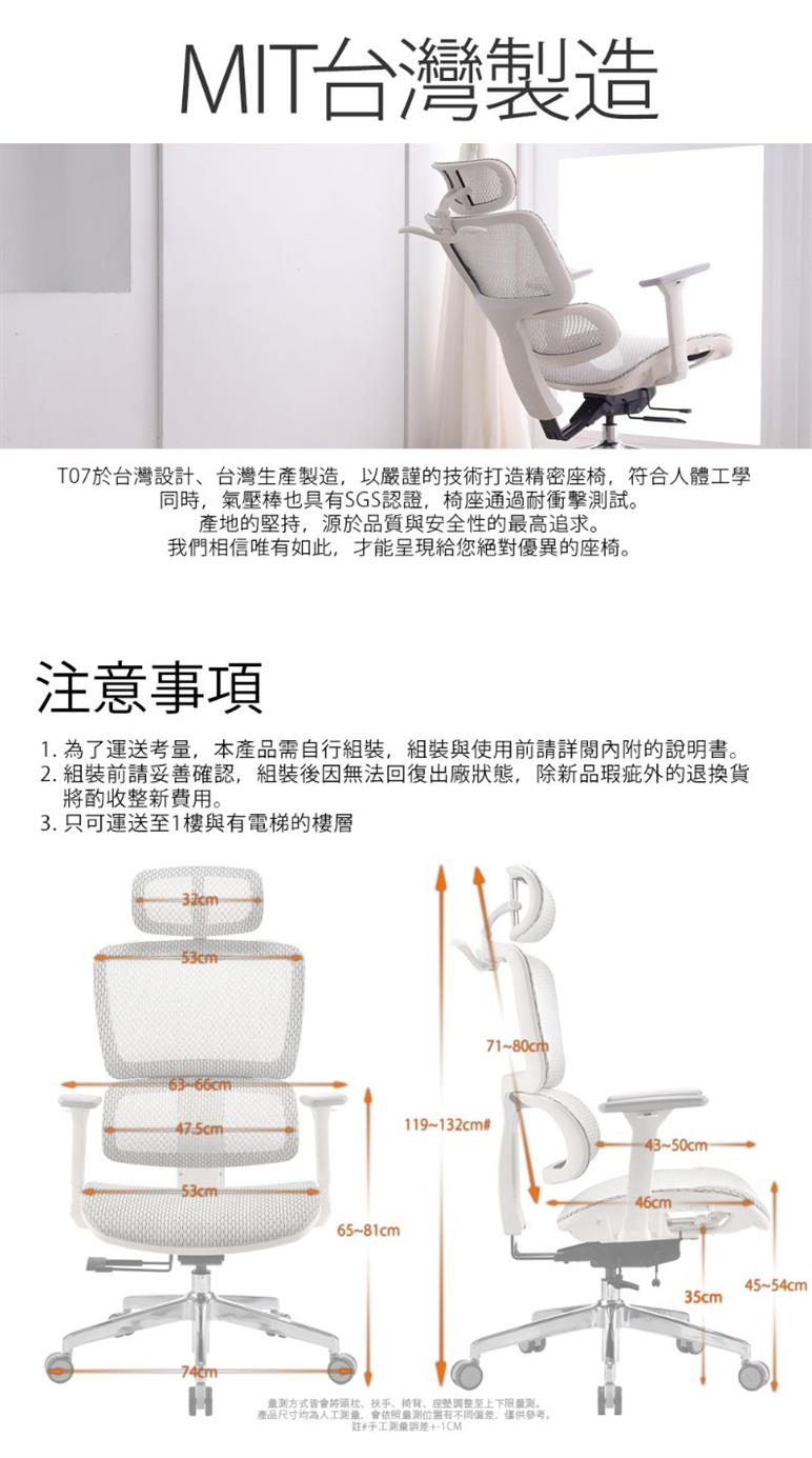 T07於台灣設計、台灣生產製造,以嚴謹的技術打造精密座椅,符合人體工學。同時,氣壓棒也具有SGS認證,椅座通過耐衝擊測試。產地的堅持,源於品質與安全性的最高追求。我們相信唯有如此,才能呈現給您絕對優異的座椅。