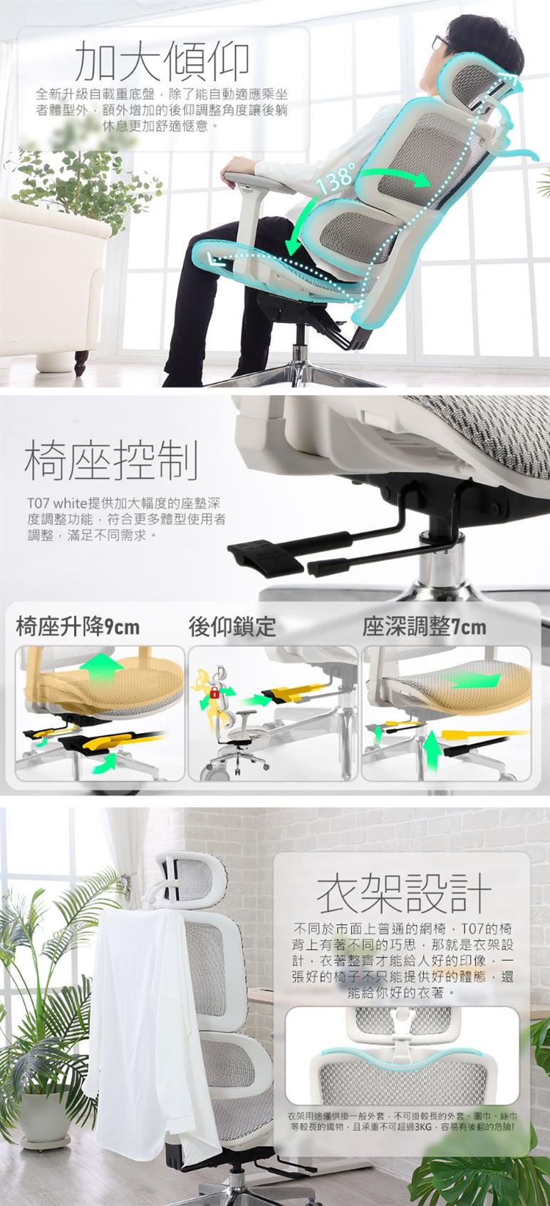 椅背型式:舒適全網布升降椅背(含衣架功能)
