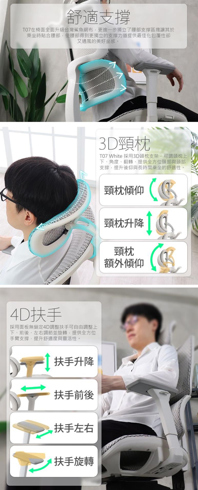 T07 White採用3D頭枕支架,可調頭枕上下、角度、翻轉、提供全方位頸部與頭部支撐,提升後仰與長時間乘坐的舒適性。
