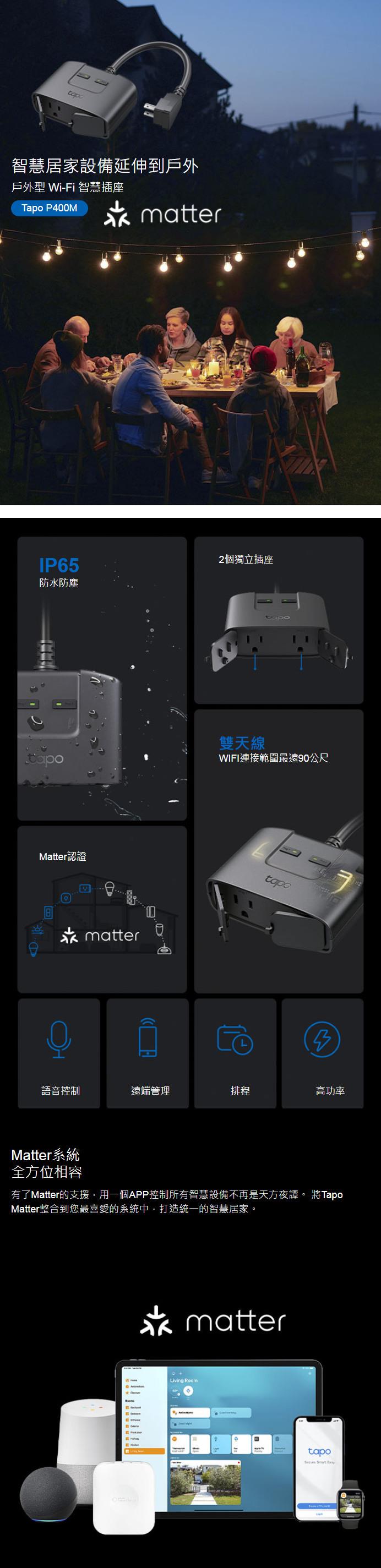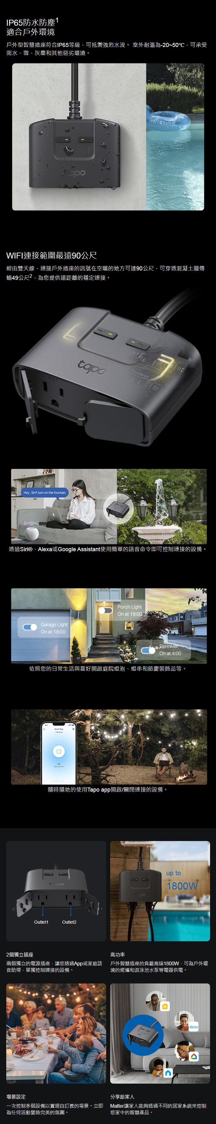 - 雙插座 – 同時使用兩台戶外區的設備,全部通過一個智慧插座即可滿足