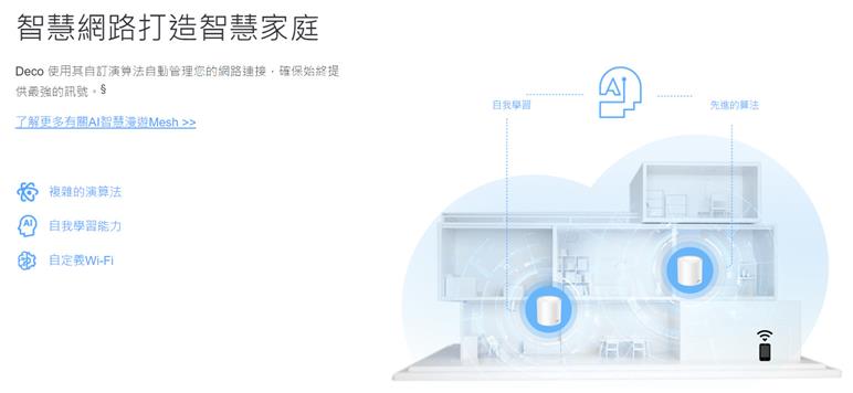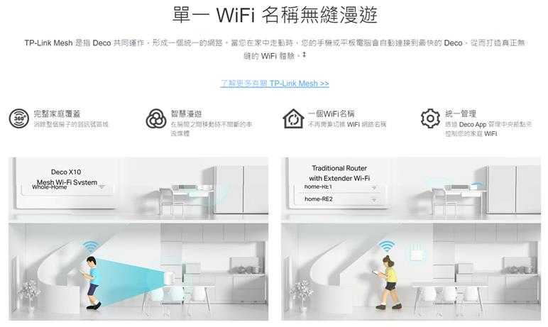 - 一個統一的網路 : 多個設備形成一個統一網路,當您在家中走動時,該網路會自動選擇最佳連接。