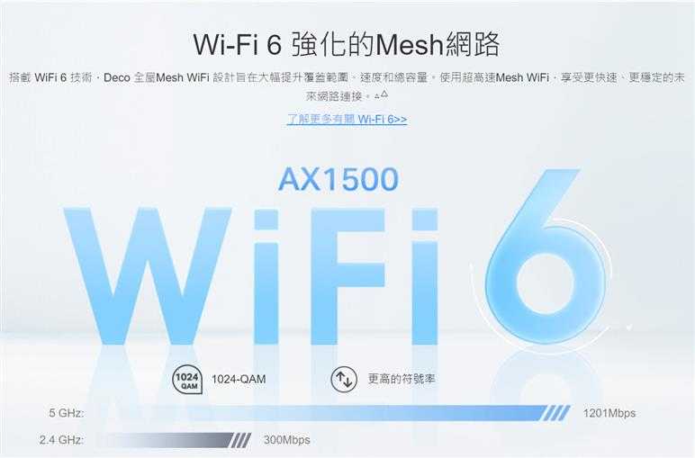 - 連接速度更快 : Wi-Fi 6 速度高達 1,500 Mbps - 在 5 GHz 上為 1,201 Mbps,在 2.4 GHz 上為 300 Mbps。†
