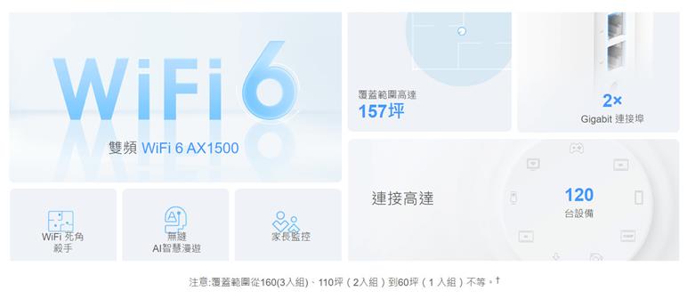 - 增強無縫覆蓋 : 透過 Wi-Fi 6 產生更清晰、更強的全屋 Wi-Fi 訊號,實現完整家庭無縫覆蓋。‡