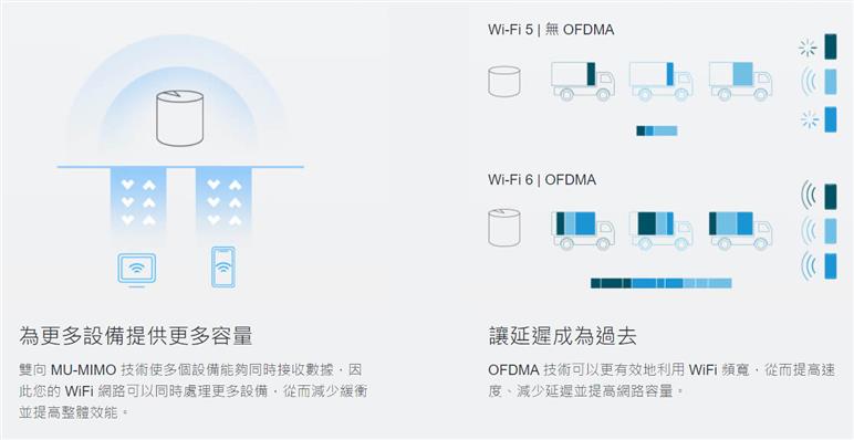 - 連接更多設備 : OFDMA 和 MU-MIMO 技術將容量提升四倍,可同時向更多設備傳輸。△