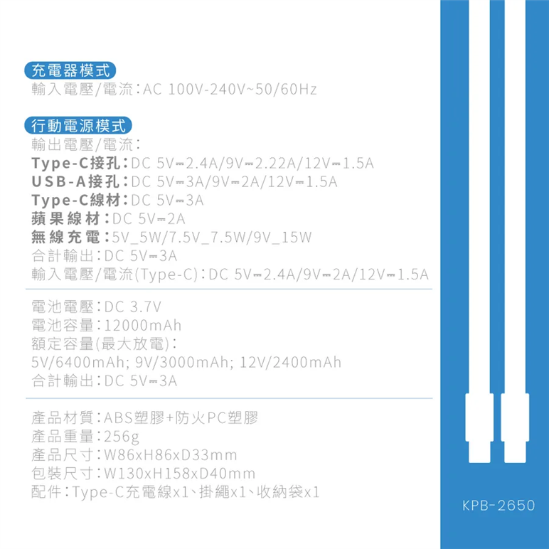 - 輸入電壓/電流(Type-C):DC 5V?2.4A/9V?2A/12V?1.5A