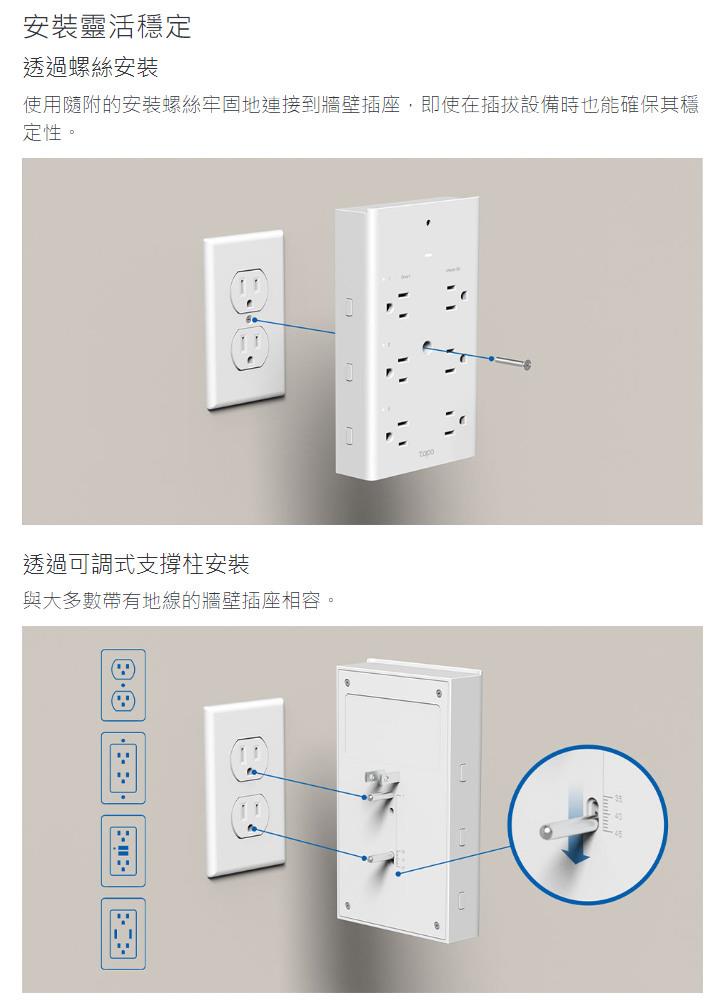 - 適合任何牆壁插座 - 使用可調節的支撐柱和安裝螺絲安裝到任何類型的牆壁插座。