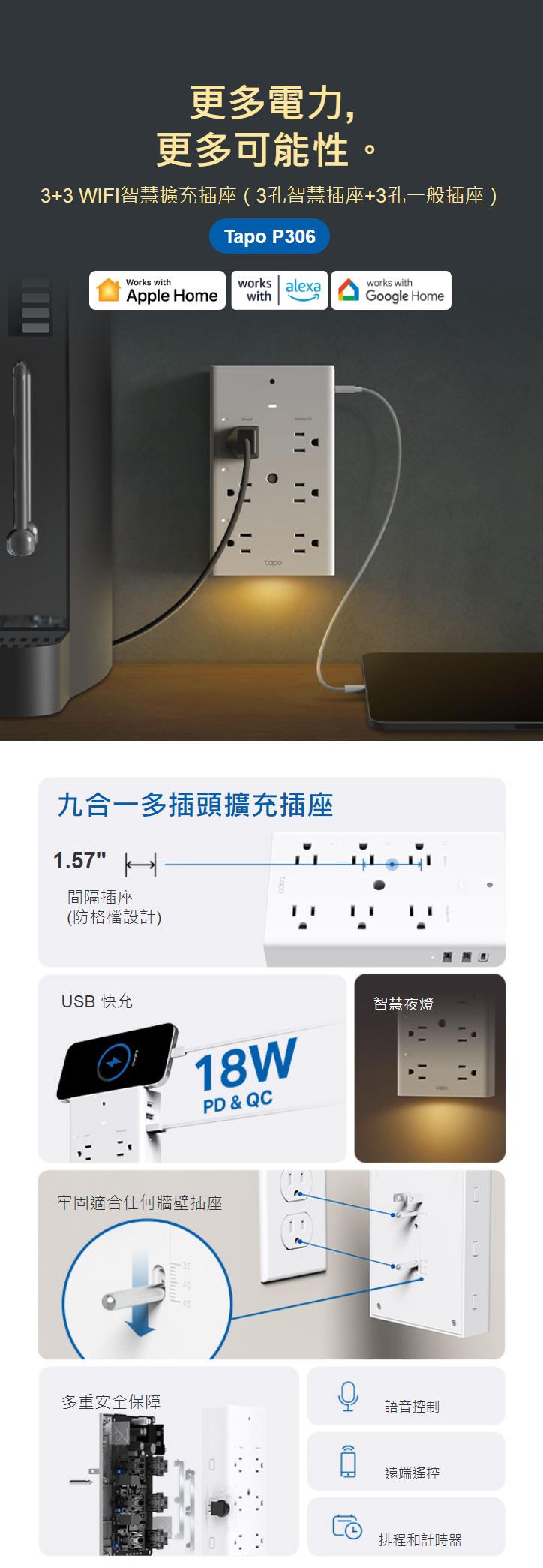 - 進階安全功能 - Tapo P306 透過先進的突波保護、高效散熱和過熱保護為您的設備保駕護航,確保安全可靠。