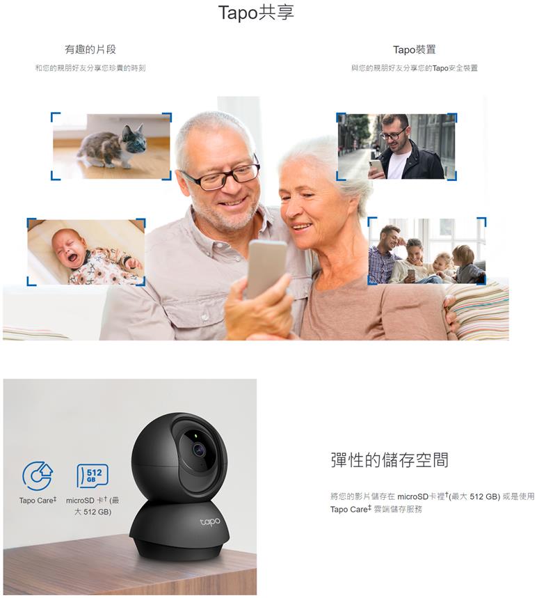 - 本地儲存與雲端儲存: 在高達 512 GB 的 microSD 卡上連續保存素材†或訂閱 Tapo Care 進行雲端儲存。‡