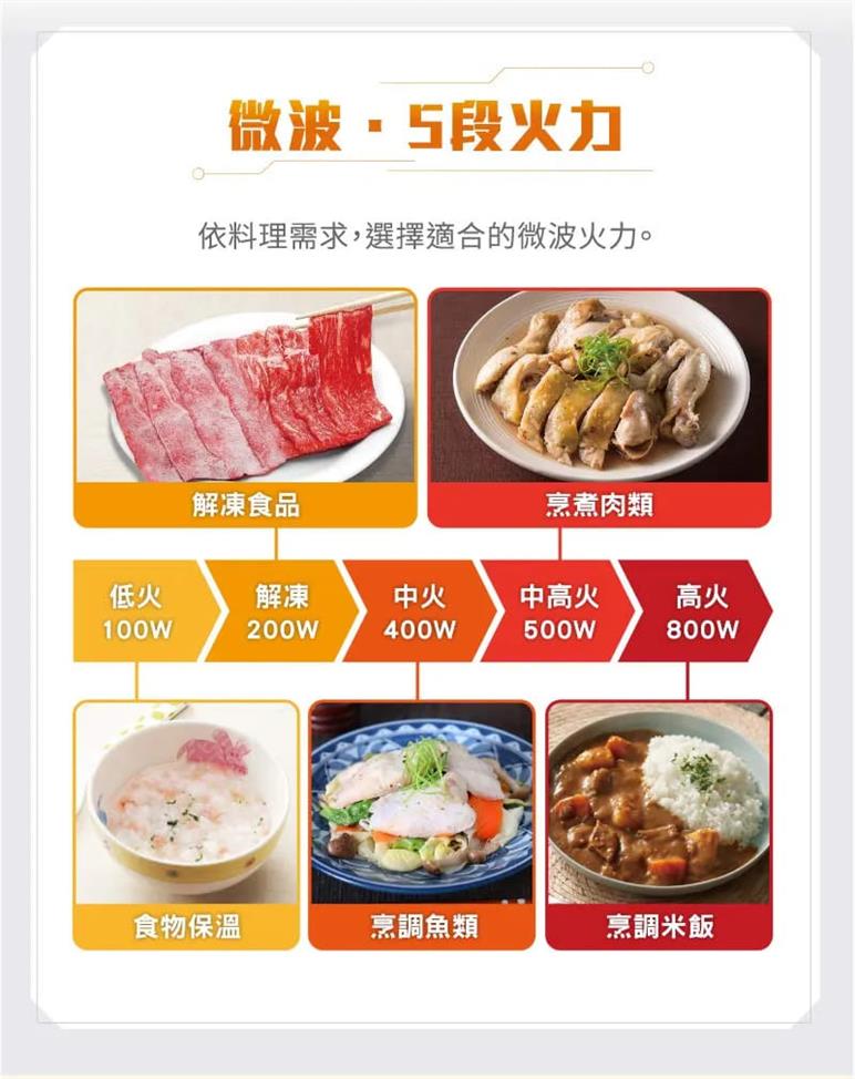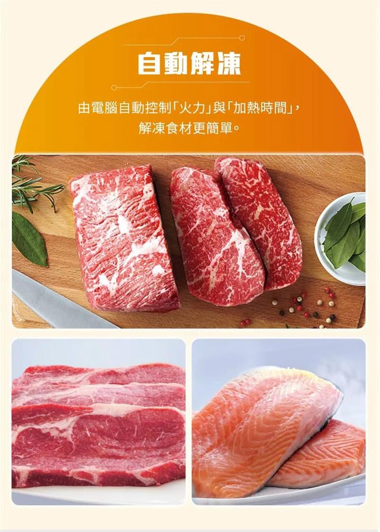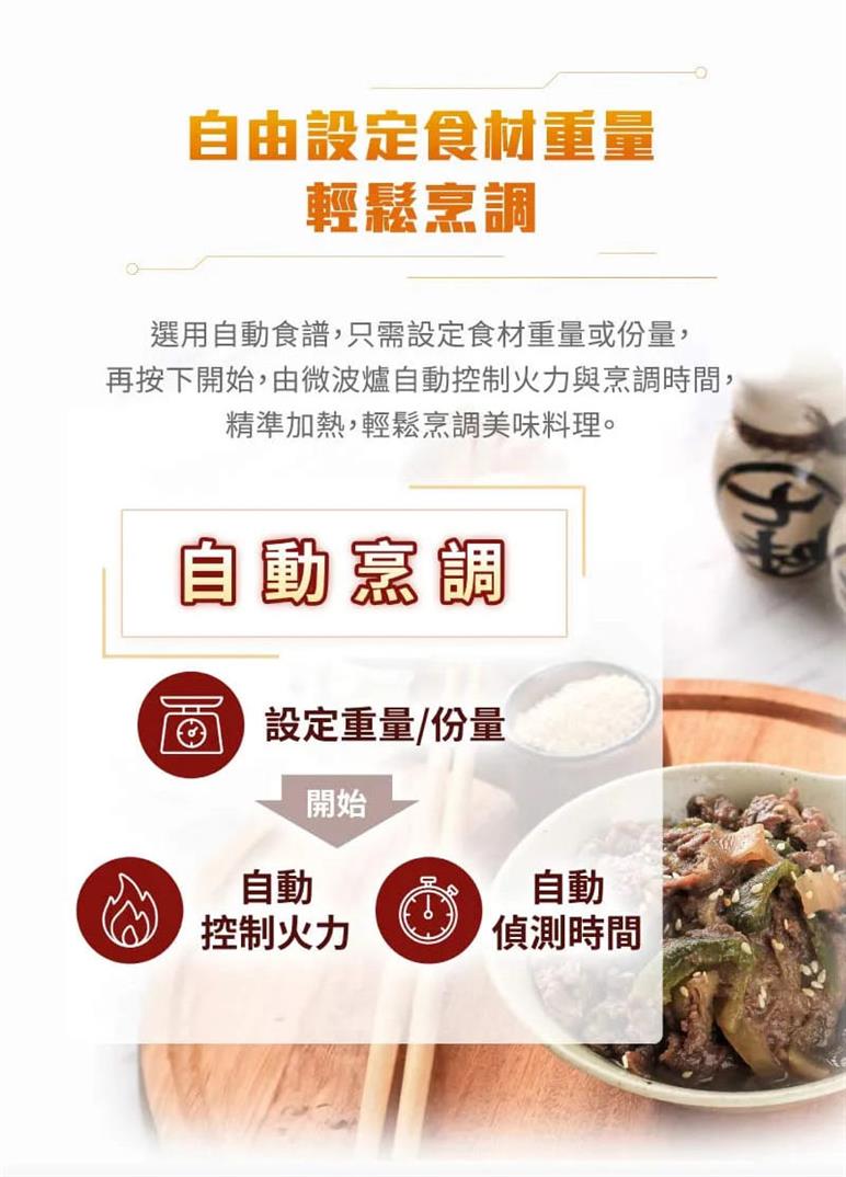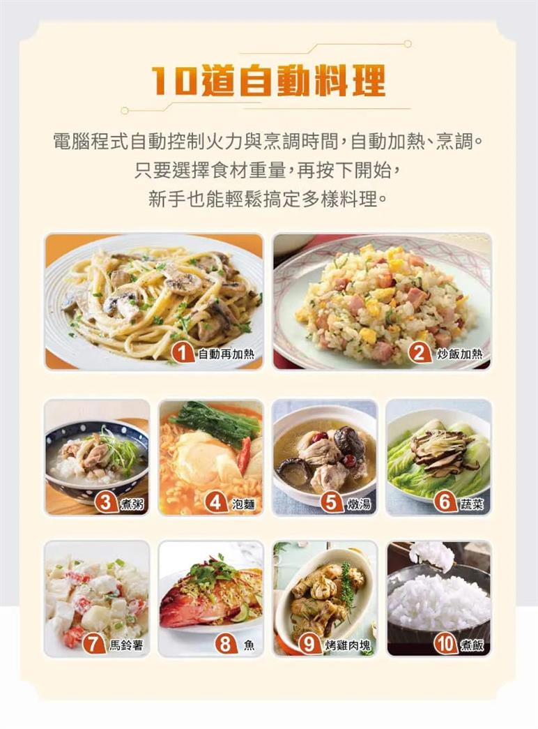 機能:自動料理10道、食材重量選擇●、手動火力調節、微波5段