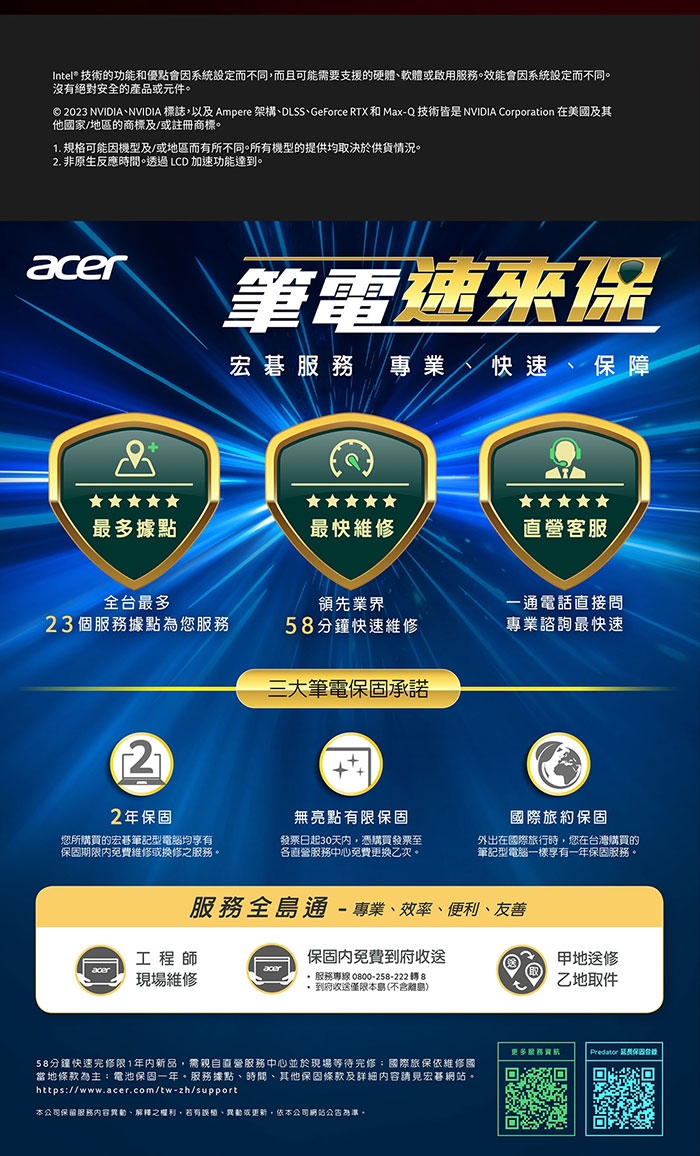 保固:二年台灣地區完全保固/一年國際旅約保固/電池保固一年/第一年58分鐘快速完修