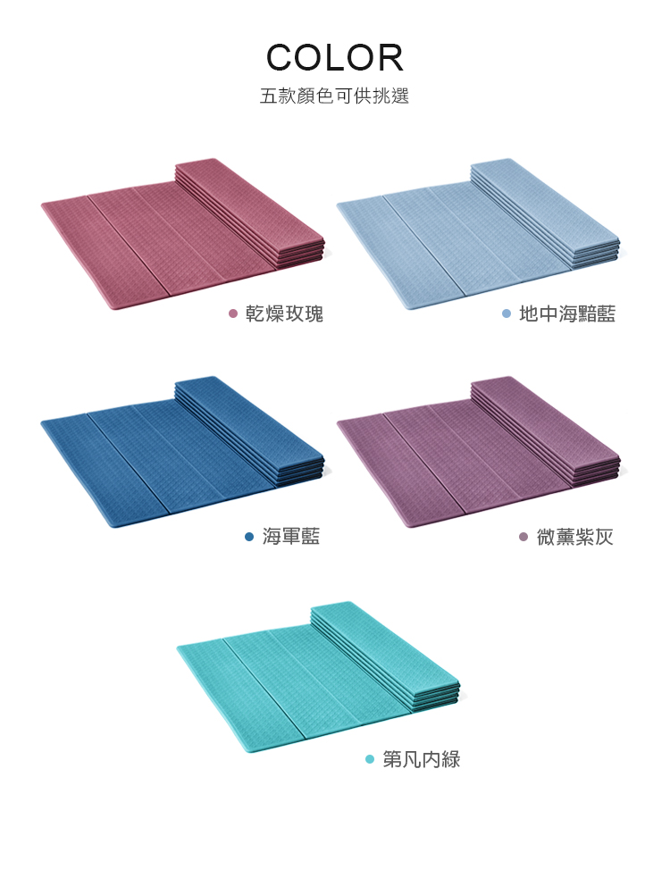 - 可折疊的瑜珈墊 → 收納快速、攜帶方便、簡單好清潔、還可充當瑜珈磚