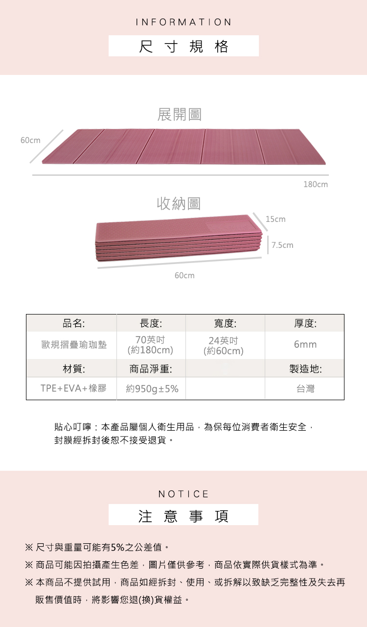 - 出貨內容:Lotus 台灣製環保TPE折疊瑜珈健身墊6mmx1入