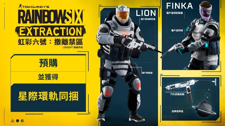 解鎖「星際環軌外觀同捆」:內含給 Finka 和 Lion 使用的「獵戶座」制服和頭部裝備、通用「汽化」武器塗裝,以及「迫降者」飾品。