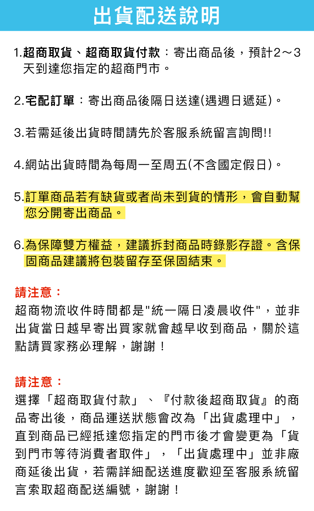 *請注意:選擇「超商取貨付款」、『付款後超商取貨』的商品寄出後,商品運送狀態會改為「出貨處理中」,直到商品已經抵達您指定的門市後才會變更為「貨到門市等待消費者取件」,「出貨處理中」並非廠商延後出貨,若需詳細配送進度歡迎至客服系統留言索取超商配送編號,謝謝!
