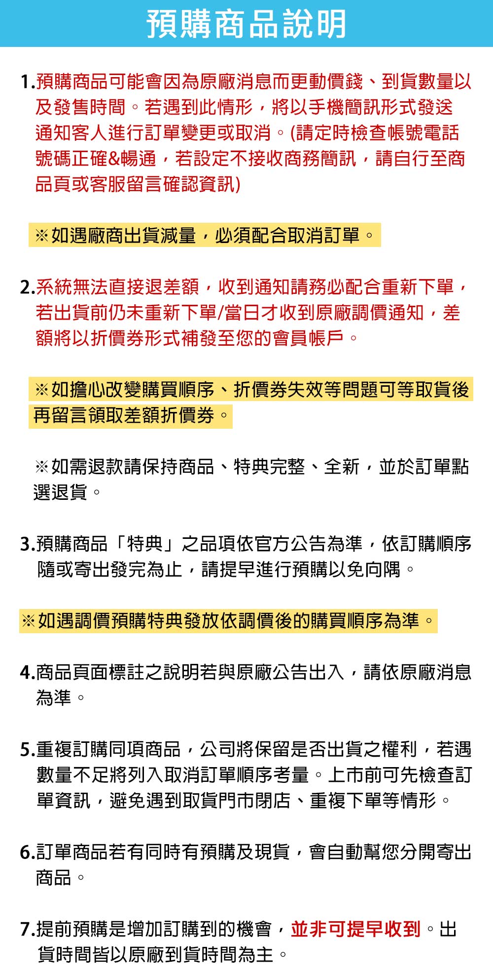1.預購商品可能會因為原廠消息而更動價錢、到貨數量以及發售時間。若遇到此情形,將以手機簡訊形式發送通知協助客人進行訂單變更或取消。