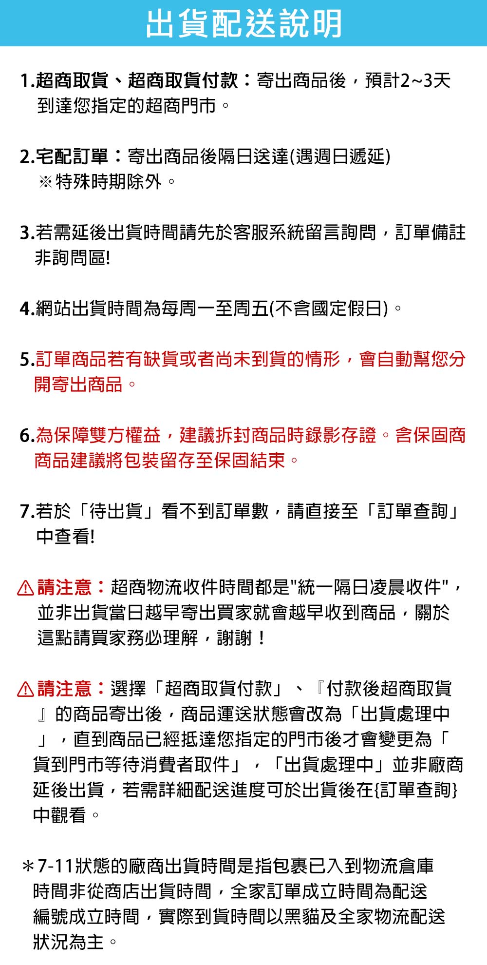 *請注意:選擇「超商取貨付款」、『付款後超商取貨』的商品寄出後,商品運送狀態會改為「出貨處理中」,直到商品已經抵達您指定的門市後才會變更為「貨到門市等待消費者取件」,「出貨處理中」並非廠商延後出貨,若需詳細配送進度歡迎至客服系統留言索取超商配送編號,謝謝!