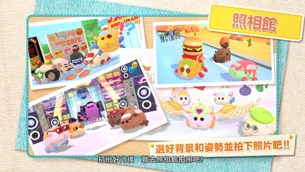 在充滿天竺鼠車車元素的世界觀下,派對中包含天竺鼠節奏、天竺鼠足球和天竺鼠警察抓小偷等各具特色的10種小遊戲,就連動畫中出現的某個遊戲也會登場?只要持續發展城鎮建設,天竺鼠車車就會來到天竺鼠鎮遊玩,玩家能遇見40種以上的天竺鼠車車,餵食喜歡的天竺鼠車車或是摸摸牠們來增進感情吧!此外,還能用80種以上的裝飾品,將天竺鼠車車打造成自己喜歡的模樣。打扮完就到照相館拍下照片,分享給朋友吧!