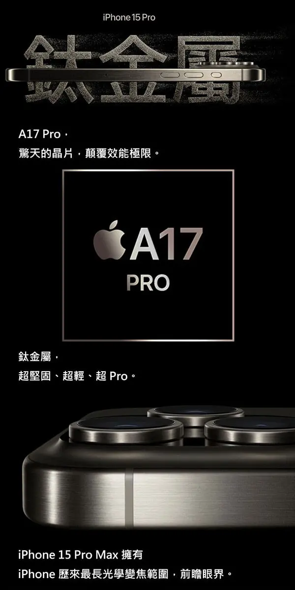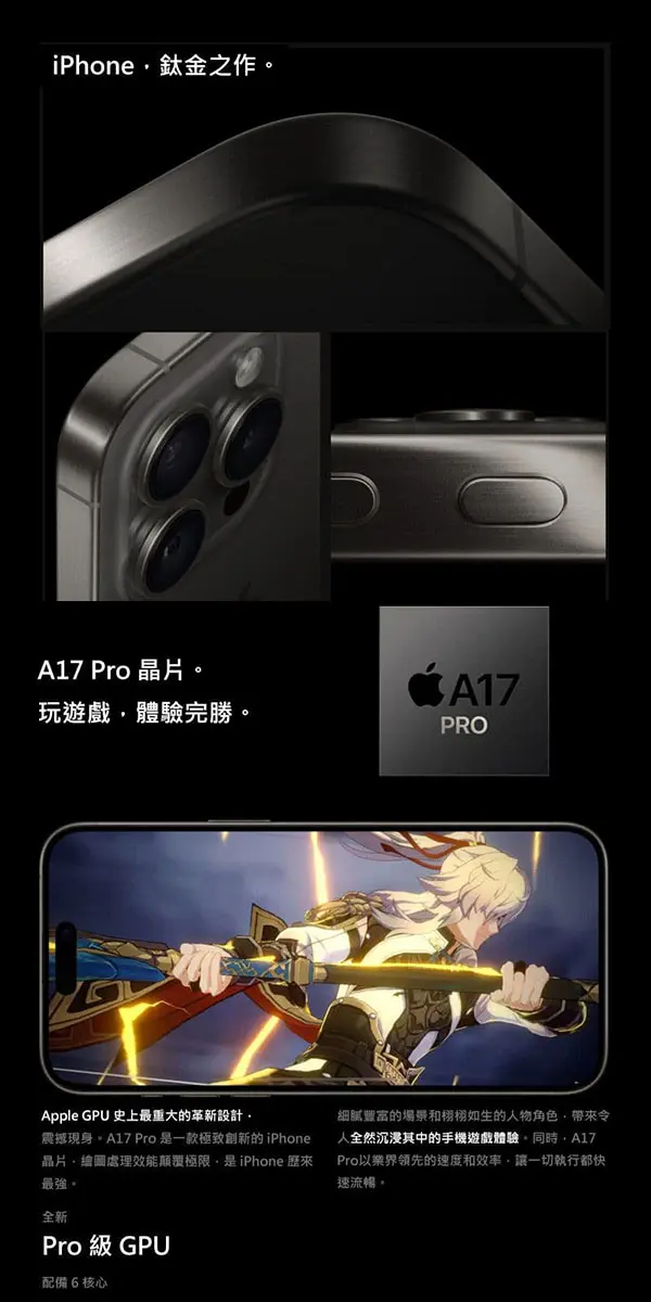 ◎晶片:A17 Pro仿生晶片、全新6核心CPU配備2個效能核心與4個節能核心、全新6核心GPU、全新16核心神經網路引擎