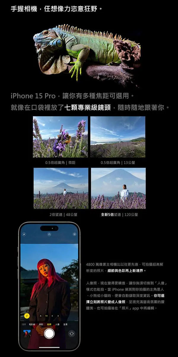 Apple iPhone 15 Pro 5G (512G版)後置4,800萬畫素主鏡頭+1,200萬畫素超廣角鏡頭+1,200萬畫素望遠鏡頭,提供多種焦距模式,具備3倍光學變焦放大,2倍光學變焦縮小,6倍光學變焦範圍,最高可達15倍數位變焦;支援人像自動偵測模式、空間影片拍攝功能,讓人像拍攝絕美吸睛。並前置1,200萬畫素原深感測相機,低光源攝影表現再度升級,讓您能輕鬆抓拍稍縱即逝的精彩瞬間。
