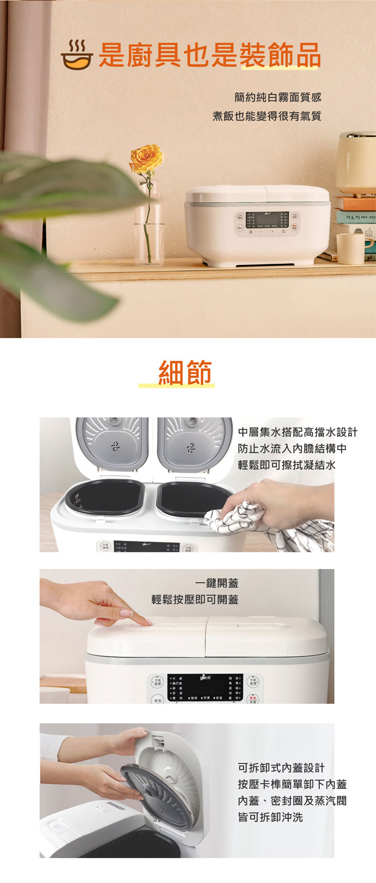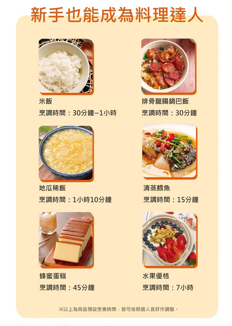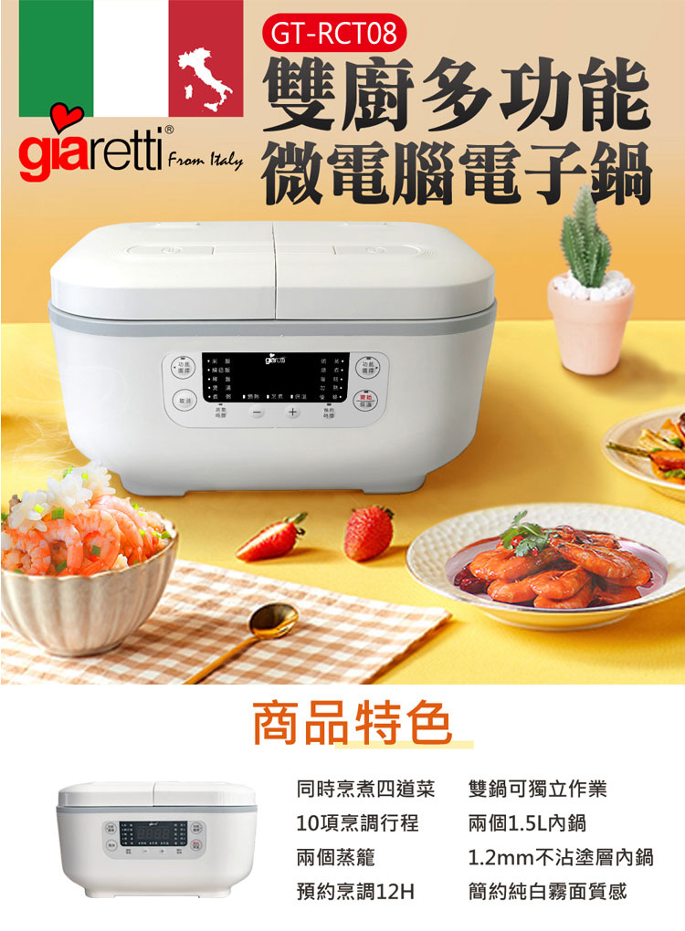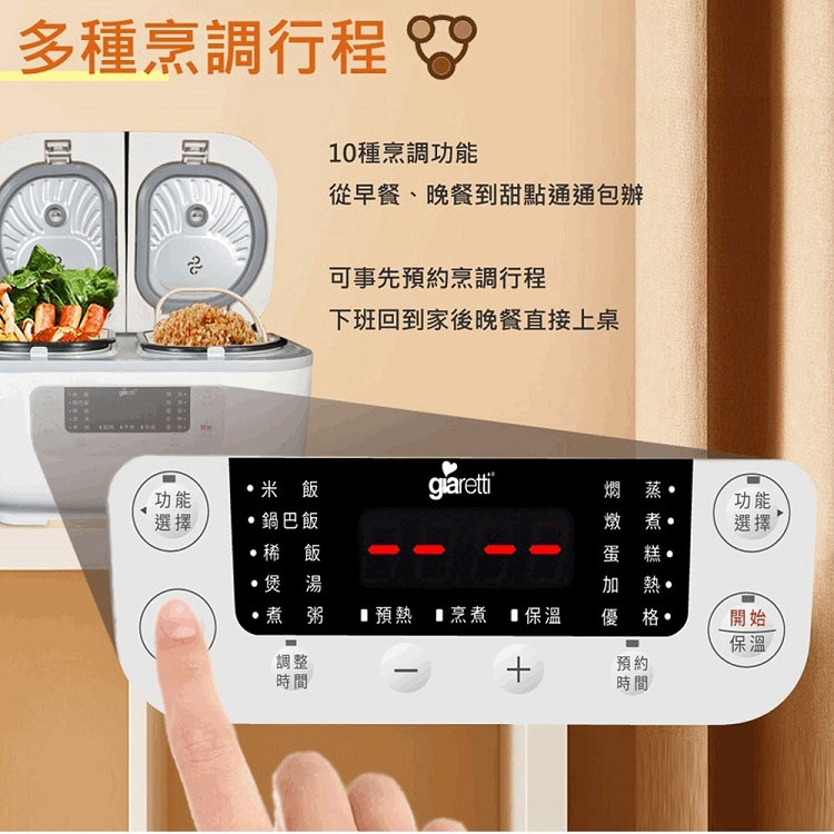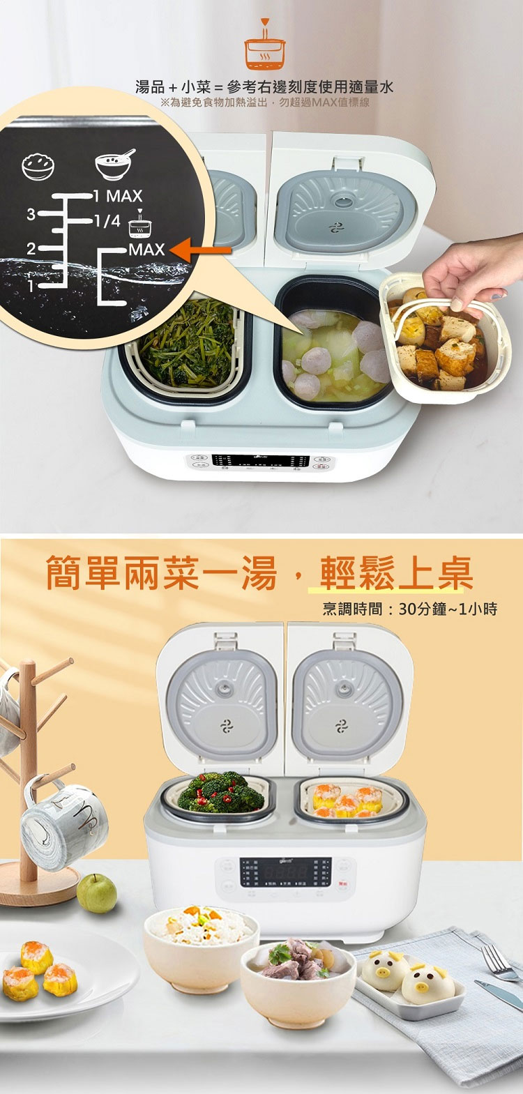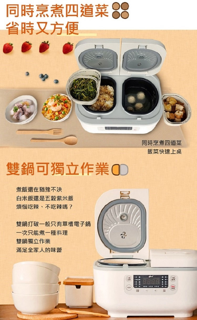 - 雙鍋可同時烹煮四道菜,雙鍋可獨立作業,10項預設烹調行程