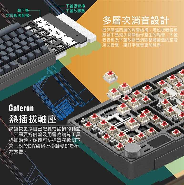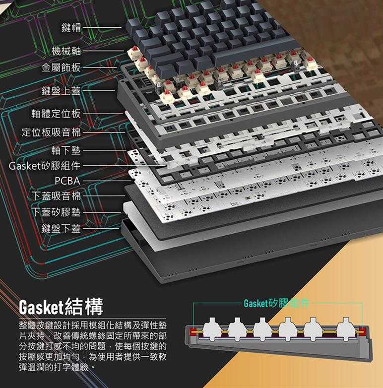 ●Gasket 均衡支撐及四層消音結構設計,提供軟彈溫潤的均一打感