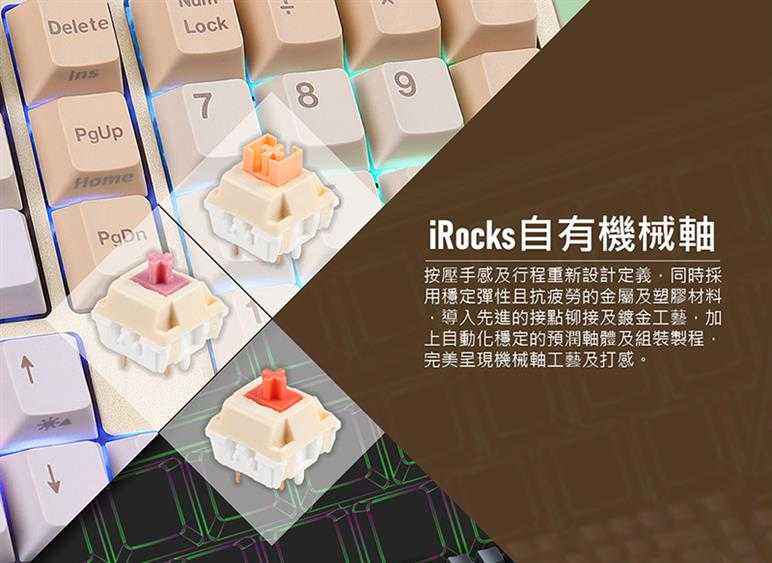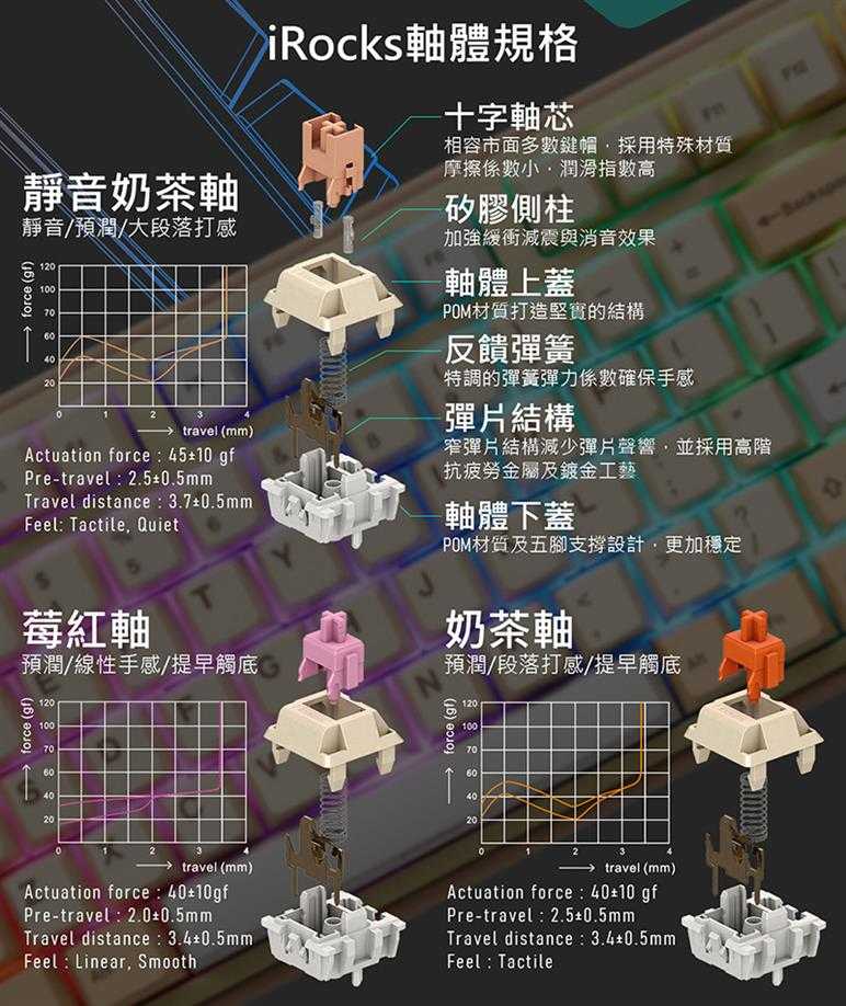 ●全鍵區採用iRocks自有特色預潤軸體跟Gateron熱插拔軸座,可自行替換鍵軸
