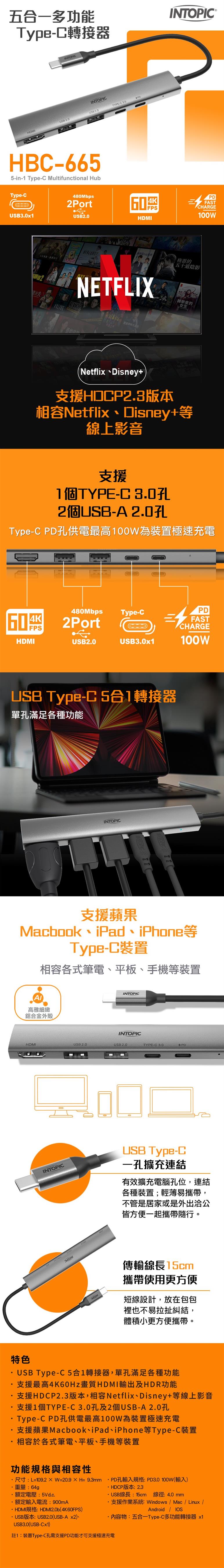 ● USB Type-C 5合1轉接器,單孔滿足各種功能