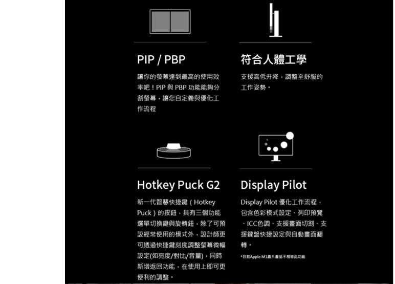 色彩模式:動畫設計 ,CAD/CAM ,暗房 ,DICOM ,HDR ,低藍光 ,M-Book ,Rec.709 ,sRGB ,使用者