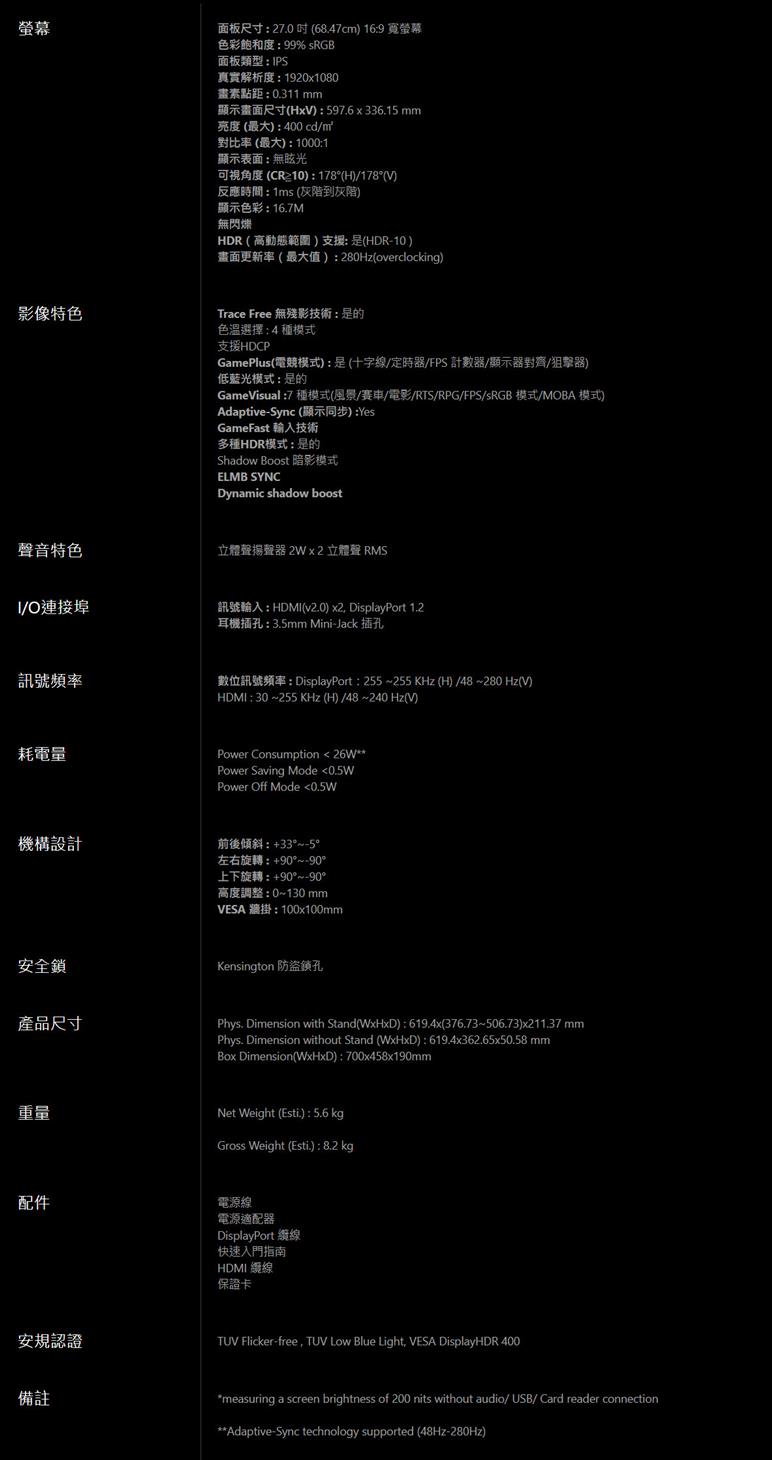 .高動態範圍(HDR)技術加上專業色域,可展現優異的對比度與色彩表現,符合DisplayHDR 400認證。