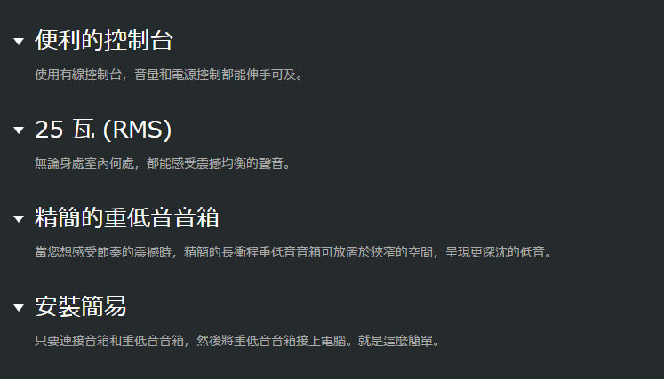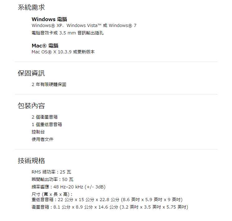 50 瓦尖峰/25 瓦 RMS 功率提供全音域範圍的平衡音效。精巧的重低音音箱提供強大的低音。拆開包裝後就能立即享受飽滿豐富的音訊體驗。