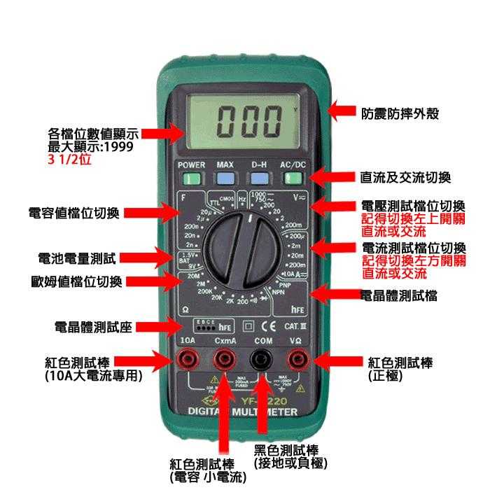 TENMARS泰瑪斯 數位3 1/2萬用三用電表 YF-3220,最高可量到1999,支援量測直流電壓、交流電壓、電池電量、電晶體腳位、蜂鳴提示、電流量測、讀值鎖定、電容測試、阻抗量測...等,是萬用的三用電錶,一般家庭、學生、維修...等都適用。