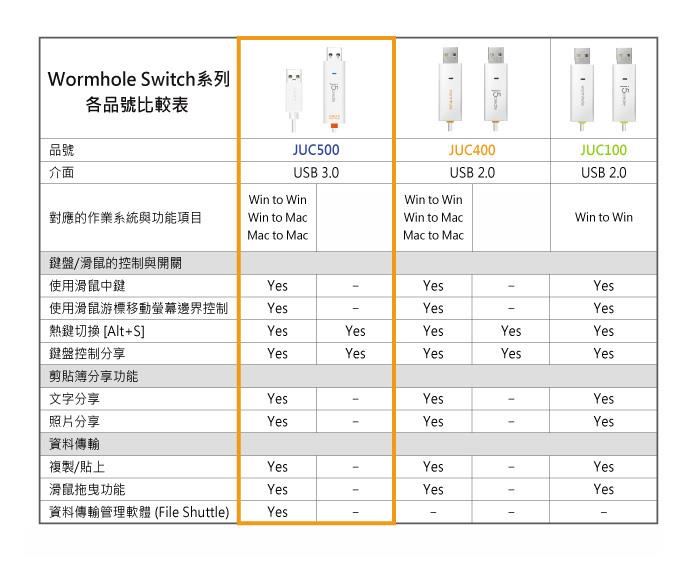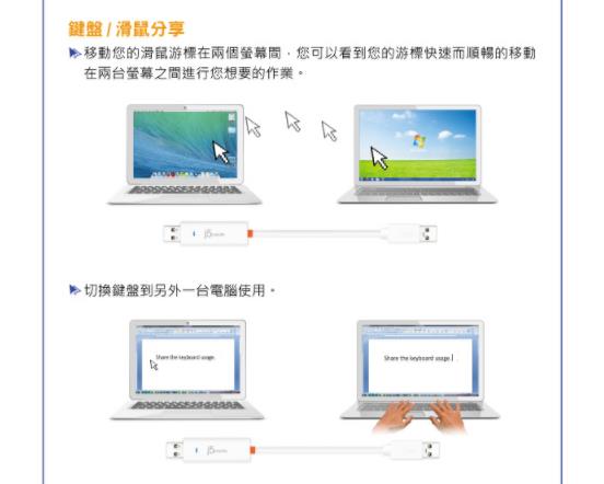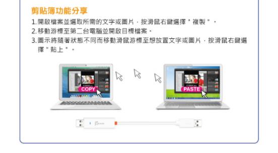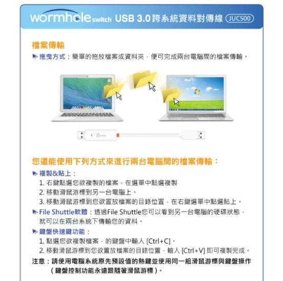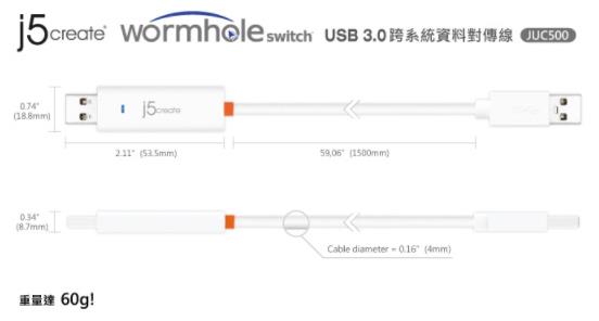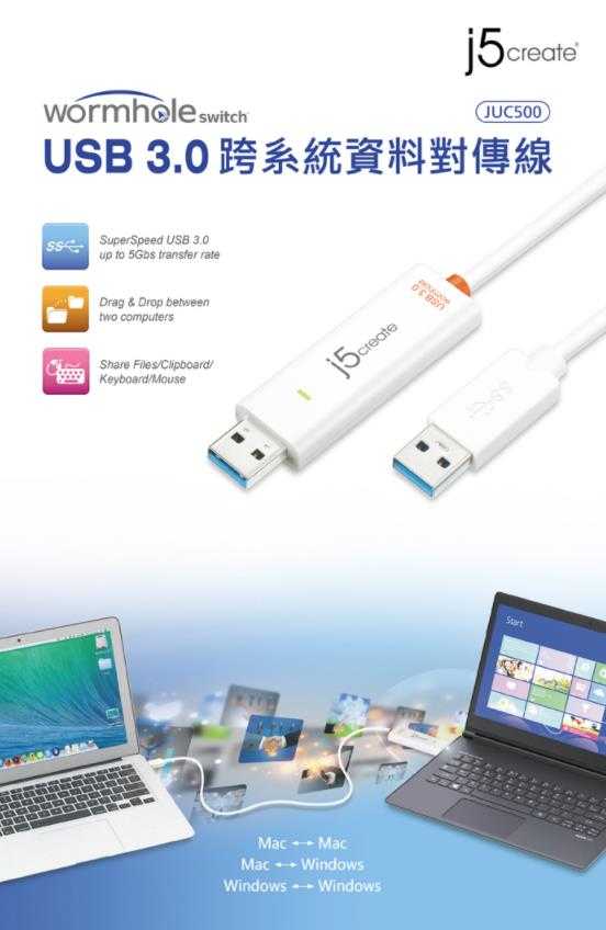 j5create JUC500 USB 3.0 跨系統資料對傳線,適用於Win-Mac、 Win-Win、 Mac-Mac、 USB 3.0線二端各插上一台電腦,讓內建的軟體開啟即可共用一組鍵盤、滑鼠,並透過滑鼠的拖曳、複製、貼上等動作,在兩台電腦間快速傳輸檔案及分享剪貼簿,非常適合文書處理,讓您工作效率倍增。
