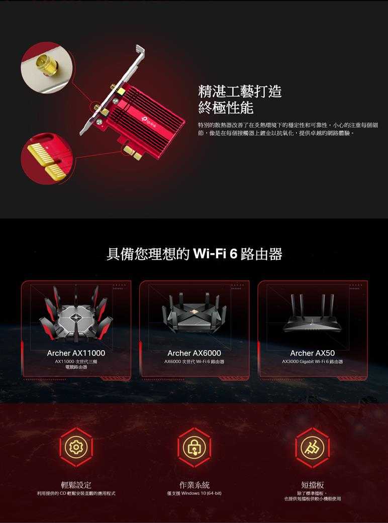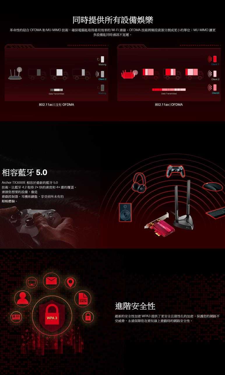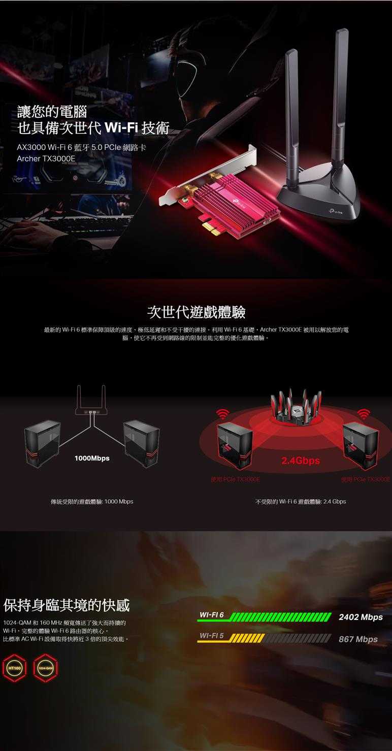 最新的 WiFi6 標準保障頂級的速度、極低延遲和不受干擾的連接。利用 WiFi6 基礎,Archer TX3000E 被用以解放您的電腦,使它不再受到網路線的限制並能完整的優化遊戲體驗。