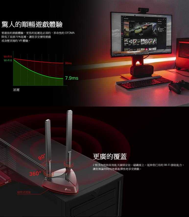 2 根多向性和高效能天線固定在一磁鐵座上,延伸您已有的 Wi-Fi 接收能力,讓您無論何時何地都能彈性地享受遊戲。