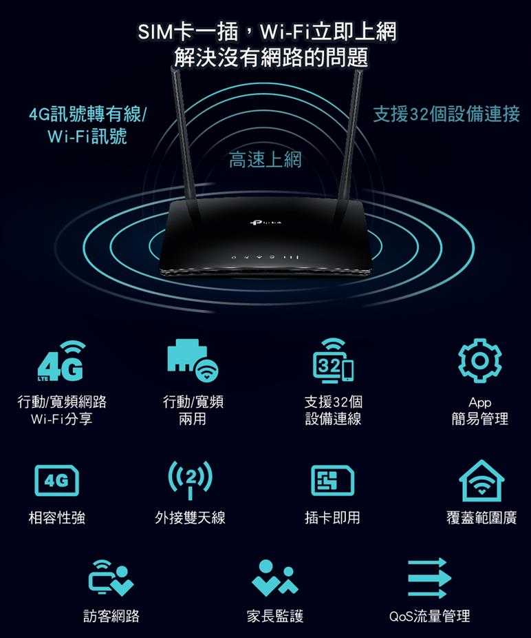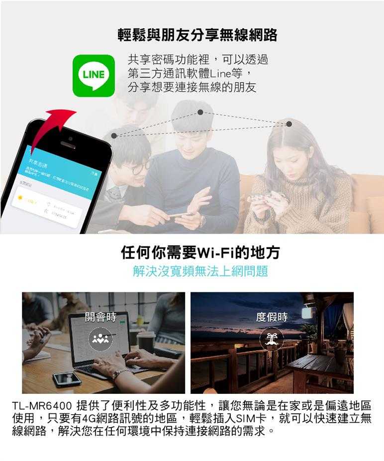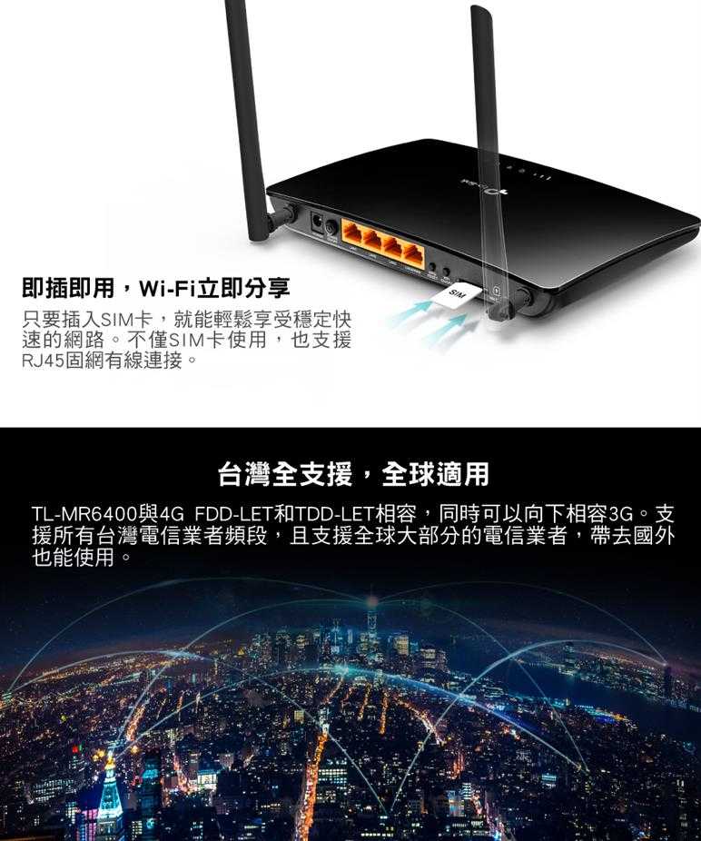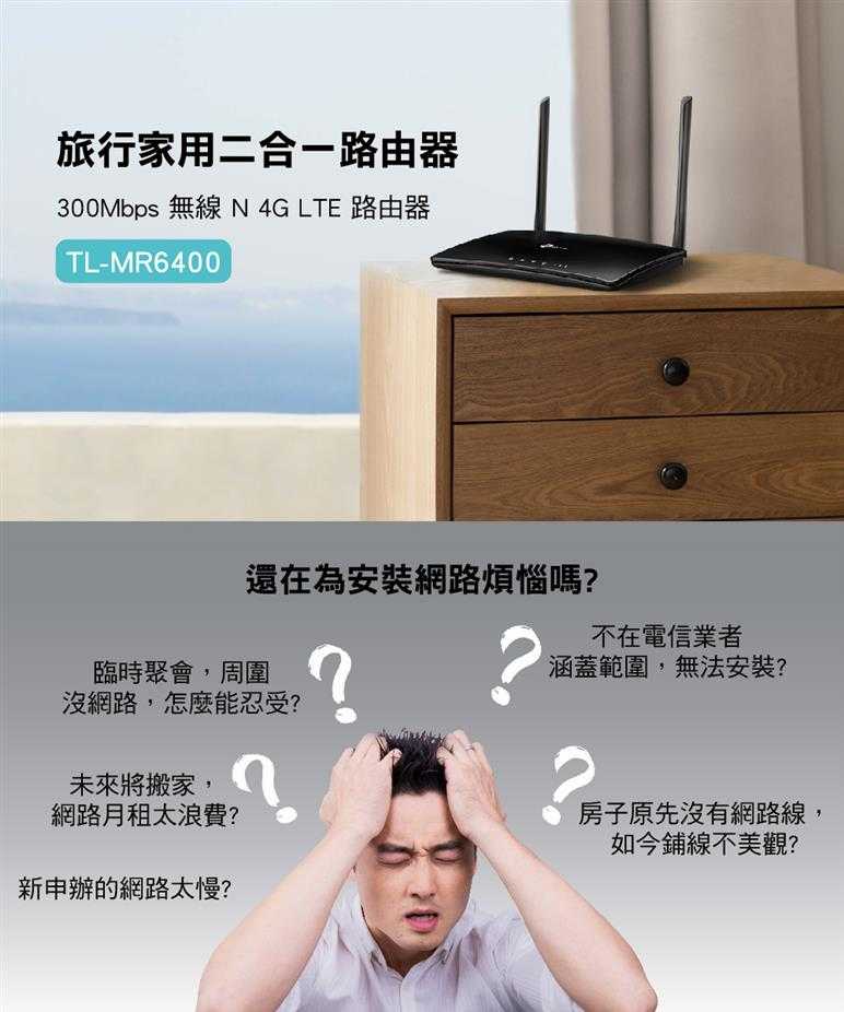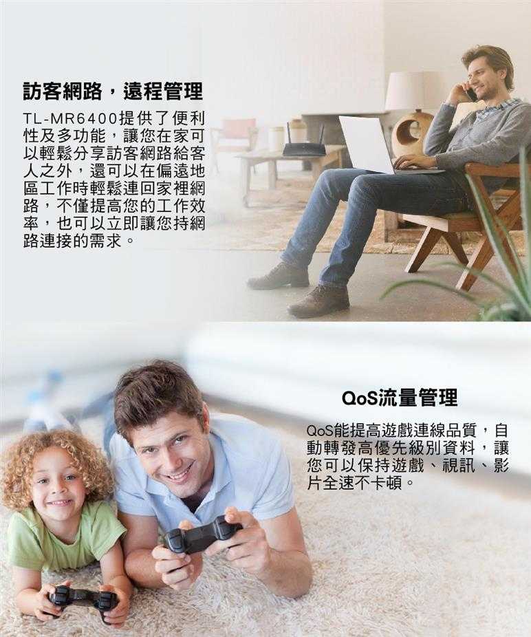 享受無與倫比的便利性和多功能性。快速建立強而有力的無線網路訊號是非常重要的,TL-MR6400是您在較偏遠地區的住家或是工作地點使用網路的最佳解決之道,僅需要接入SIM卡即可提高工作效率並在各種環境中保持連接。不管是展演中心還是露營車上,TL-MR6400都能滿足您的需求。