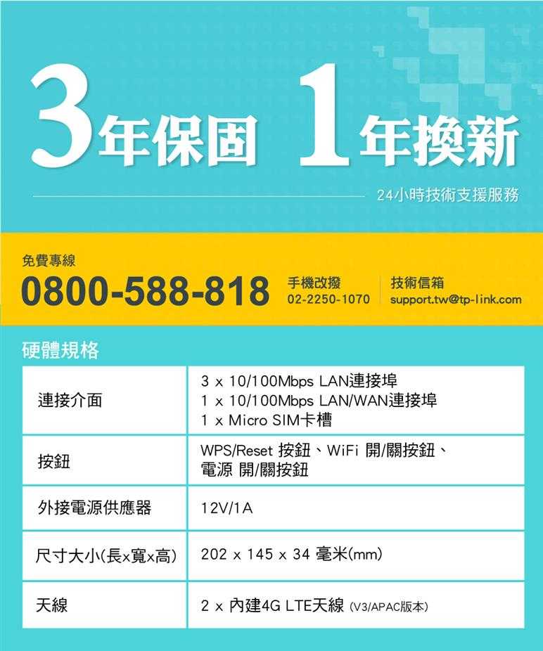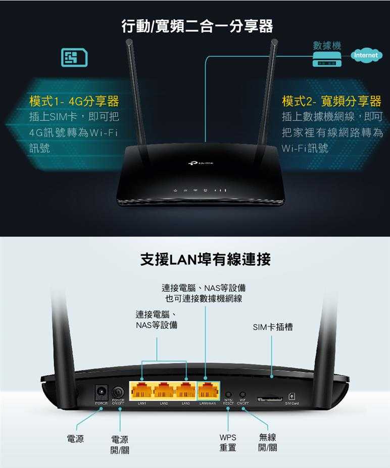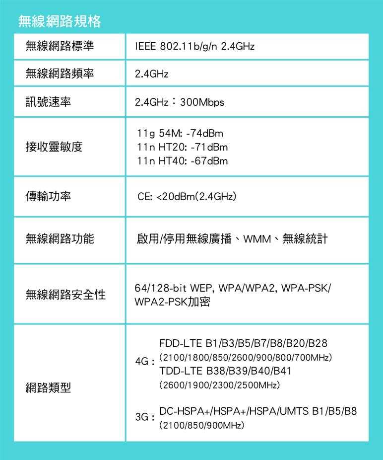 | 運作模式 | 3G/4G路由器模式、無線路由器模式 |