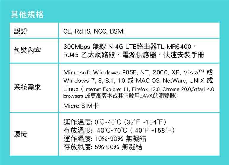 Microsoft Windows 98SE, NT, 2000, XP, Vista™ or Windows 7, 8, 8.1, 10 MAC OS, NetWare, UNIX 或 Linux Internet Explorer 11, Firefox 12.0, Chrome 20.0, Safari 4.0以上瀏覽器,或其他Java架構的瀏覽器 Micro SIM卡 |