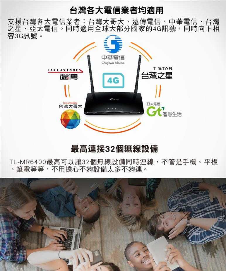 TL-MR6400可輕鬆分享3G/4G連線供高達32個無線網路設備像是平板電腦、筆記型電腦和手機使用。除此之外,LAN連接埠也能另外提供桌上型電腦進行有線網路連接。