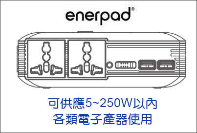 提供AC 110V、USB Type A + Type C、最高輸出250W、連續輸出200W以下電子產品