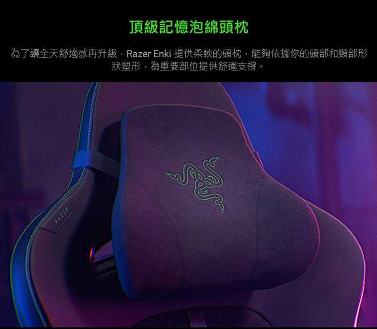 為了讓全天舒適感再升級,Razer Enki 提供柔軟的頭枕,能夠依據你的頭部和頸部形狀塑形,為重要部位提供舒適支撐。